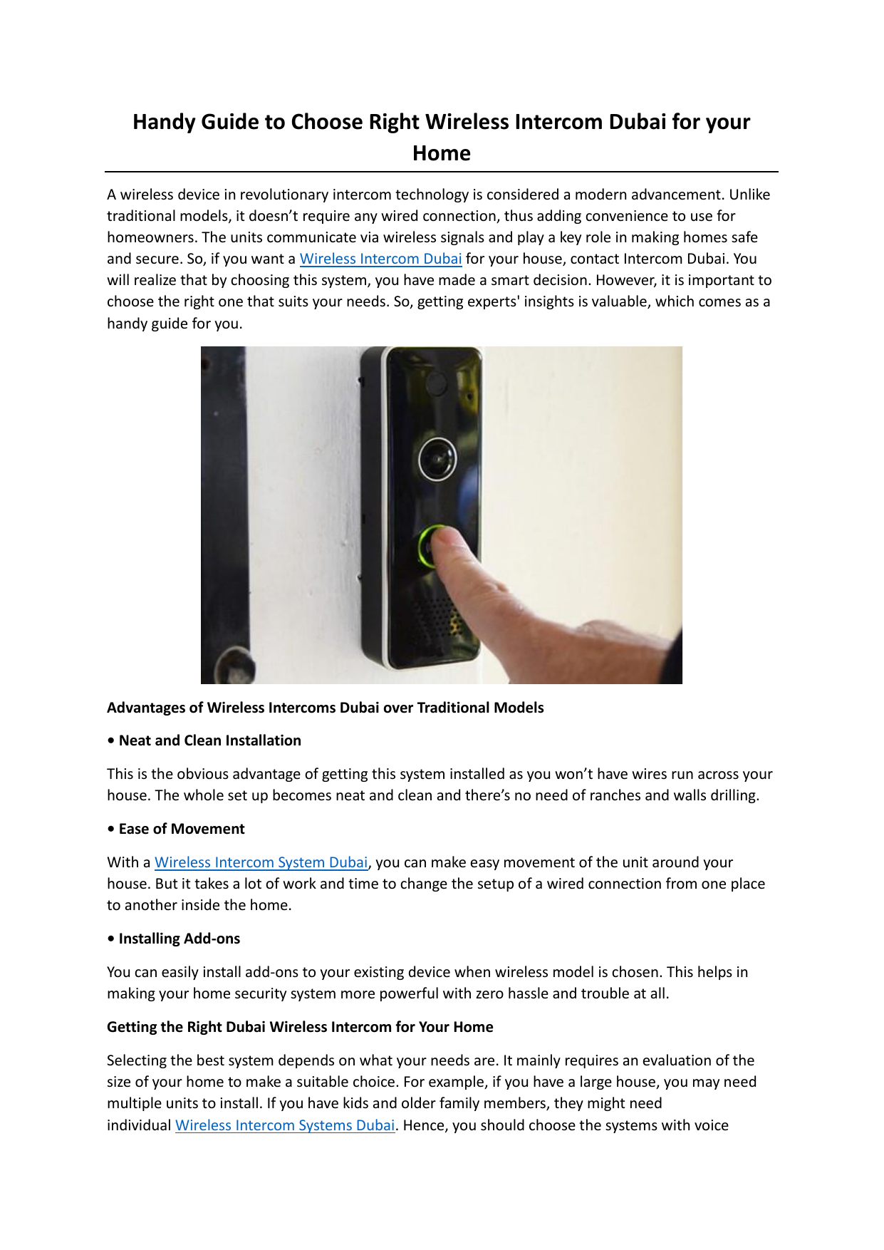 Handy Guide to Choose Right Wireless Intercom Dubai for your Home A wireless device in revolutionary intercom technology is considered a modern advancement. Unlike traditional models, it doesn’t require any wired connection, thus adding convenience to use for homeowners. The units communicate via wireless signals and play a key role in making homes safe and secure. So, if you want a Wireless Intercom Dubai for your house, contact Intercom Dubai. You will realize that by choosing this system, you have made a smart decision. However, it is important to choose the right one that suits your needs. So, getting experts' insights is valuable, which comes as a handy guide for you. Advantages of Wireless Intercoms Dubai over Traditional Models • Neat and Clean Installation This is the obvious advantage of getting this system installed as you won’t have wires run across your house. The whole set up becomes neat and clean and there’s no need of ranches and walls drilling. • Ease of Movement With a Wireless Intercom System Dubai, you can make easy movement of the unit around your house. But it takes a lot of work and time to change the setup of a wired connection from one place to another inside the home. • Installing Add-ons You can easily install add-ons to your existing device when wireless model is chosen. This helps in making your home security system more powerful with zero hassle and trouble at all. Getting the Right Dubai Wireless Intercom for Your Home Selecting the best system depends on what your needs are. It mainly requires an evaluation of the size of your home to make a suitable choice. For example, if you have a large house, you may need multiple units to install. If you have kids and older family members, they might need individual Wireless Intercom Systems Dubai. Hence, you should choose the systems with voice activation so that every member can make two-way communication. Also, for visitors, your loved ones can easily establish video and audio communication to grant access. Go for Professional Installation of Dubai Wireless Intercoms No doubt, the installation process for wireless intercommunication devices is easy and quick. But still, it is advisable to carry out the process through professional installer services. The experts know the best places for placement of these units and how to fix them on walls. They also ensure that the placement of these devices is not affected by other wired devices inside the home. Moreover, they can provide you with a variety of models and suggest the best ones. They can also integrate the system with existing security devices, such as CCTVs in your home. The Final Words Choosing the right Wireless Intercom Dubai might be intimidating experience for you. Especially when there are several considerations to make, you might feel confusing and overwhelming. So, at Intercom Dubai, you can ask the experts to get recommendation for the best device. This ensure that you have made right selection for security of your home.