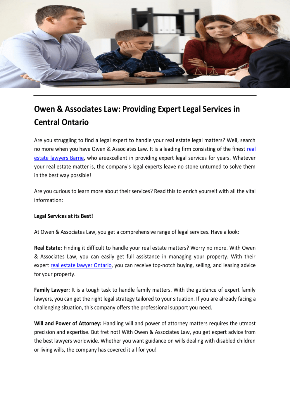 Owen & Associates Law: Providing Expert Legal Services in Central Ontario Are you struggling to find a legal expert to handle your real estate legal matters? Well, search no more when you have Owen & Associates Law. It is a leading firm consisting of the finest real estate lawyers Barrie, who areexcellent in providing expert legal services for years. Whatever your real estate matter is, the company's legal experts leave no stone unturned to solve them in the best way possible! Are you curious to learn more about their services? Read this to enrich yourself with all the vital information: Legal Services at its Best! At Owen & Associates Law, you get a comprehensive range of legal services. Have a look: Real Estate: Finding it difficult to handle your real estate matters? Worry no more. With Owen & Associates Law, you can easily get full assistance in managing your property. With their expert real estate lawyer Ontario, you can receive top-notch buying, selling, and leasing advice for your property. Family Lawyer: It is a tough task to handle family matters. With the guidance of expert family lawyers, you can get the right legal strategy tailored to your situation. If you are already facing a challenging situation, this company offers the professional support you need. Will and Power of Attorney: Handling will and power of attorney matters requires the utmost precision and expertise. But fret not! With Owen & Associates Law, you get expert advice from the best lawyers worldwide. Whether you want guidance on wills dealing with disabled children or living wills, the company has covered it all for you! Estates: Finding it difficult to handle the administration of your estates? If this is your concern, you are in the right place. Owen & Associates Law aids you in preparing all the necessary documents to handle property and banking-related matters. Further, their legal experts also professionally protect both trustees and beneficiaries. Why Choose Owen & Associates Law: The company helps simplify the legal terms in such a way that even a layman can grasp complex legal terms with ease. Further, their legal experts have years of experience that provide the most reliable solution to the customer. Whether you want guidance on a small claims attorney or any other legal matter, the company has covered it all for you! So, what are you waiting for? Expert legal advice is just a call away! Get in touch with the most experienced lawyers in Ontario and easily resolve any legal matter. For more information, visit https://www.owendickey.com/ Original Source: https://bit.ly/3ZnwAAq