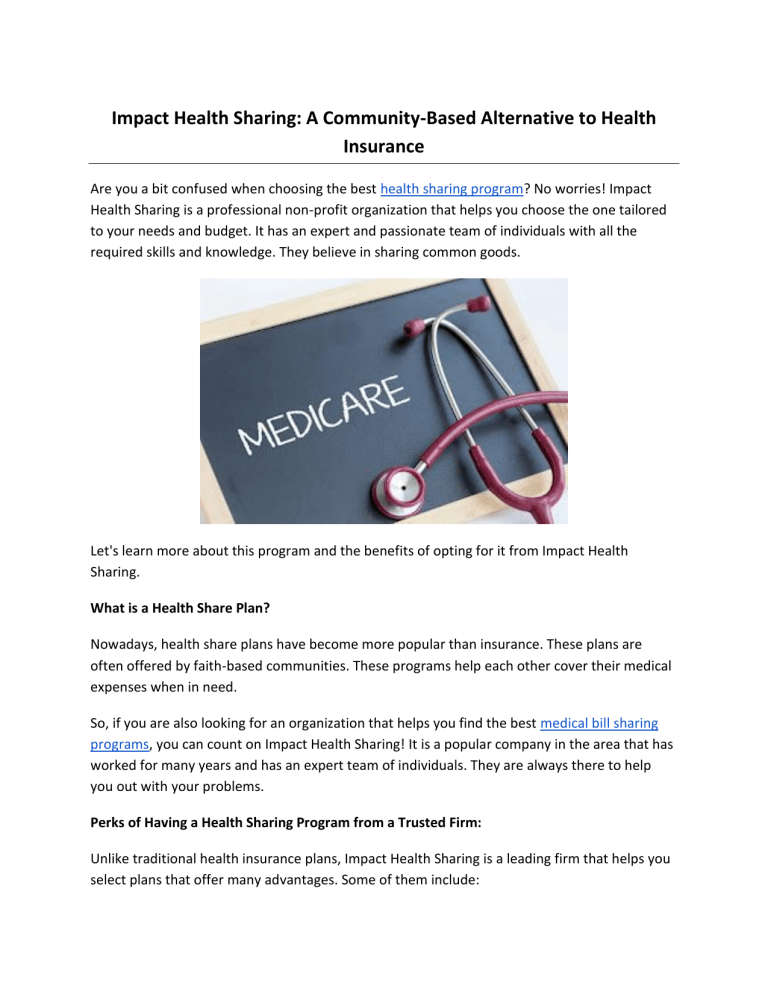 Impact Health Sharing: A Community-Based Alternative to Health Insurance Are you a bit confused when choosing the best health sharing program? No worries! Impact Health Sharing is a professional non-profit organization that helps you choose the one tailored to your needs and budget. It has an expert and passionate team of individuals with all the required skills and knowledge. They believe in sharing common goods. Let's learn more about this program and the benefits of opting for it from Impact Health Sharing. What is a Health Share Plan? Nowadays, health share plans have become more popular than insurance. These plans are often offered by faith-based communities. These programs help each other cover their medical expenses when in need. So, if you are also looking for an organization that helps you find the best medical bill sharing programs, you can count on Impact Health Sharing! It is a popular company in the area that has worked for many years and has an expert team of individuals. They are always there to help you out with your problems. Perks of Having a Health Sharing Program from a Trusted Firm: Unlike traditional health insurance plans, Impact Health Sharing is a leading firm that helps you select plans that offer many advantages. Some of them include: ● ● ● ● Support from a community Cost-savings Flexible healthcare coverage Personalized care and more. In conclusion, these are some benefits of having a health share plan over insurance. If you also want to secure your future and rely on a trusted plan, choose a health share plan over traditional insurance. Opt for a professional firm, like Impact Health Sharing! It recommends plans tailored to your needs. Why Trust Impact Health Sharing? Impact Health Sharing is a leading firm that recommends the best medical sharing programs. These programs help you to keep your future secure. It is a non-profit organization where members share medical expenses to help each other. Here are a few reasons to choose the services from this firm, which include: ● ● ● ● A creative and passionate team of individuals Commitment to excellence and development Follows the application of beliefs, ethics, and Christian faith One essential reason to choose the programs from this firm is that it is a non-profit organization, not an insurance company. In conclusion, these are some main reasons for a health share program from Impact Health Sharing. So, what are you looking for? Search their official website and choose a plan to secure your future with the best programs offered by this company. To get more details, visit https://www.impacthealthsharing.com/ Original Source: https://bit.ly/3FuVFCY