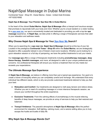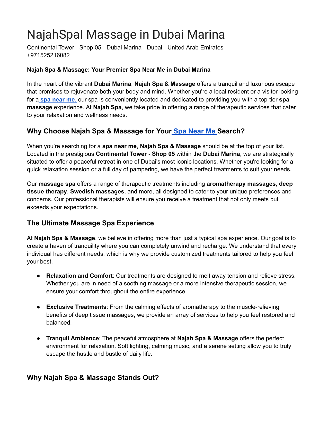 NajahSpaI Massage in Dubai Marina Continental Tower - Shop 05 - Dubai Marina - Dubai - United Arab Emirates +971525216082 Najah Spa & Massage: Your Premier Spa Near Me in Dubai Marina In the heart of the vibrant Dubai Marina, Najah Spa & Massage offers a tranquil and luxurious escape that promises to rejuvenate both your body and mind. Whether you're a local resident or a visitor looking for a spa near me, our spa is conveniently located and dedicated to providing you with a top-tier spa massage experience. At Najah Spa, we take pride in offering a range of therapeutic services that cater to your relaxation and wellness needs. Why Choose Najah Spa & Massage for Your Spa Near Me Search? When you’re searching for a spa near me, Najah Spa & Massage should be at the top of your list. Located in the prestigious Continental Tower - Shop 05 within the Dubai Marina, we are strategically situated to offer a peaceful retreat in one of Dubai’s most iconic locations. Whether you're looking for a quick relaxation session or a full day of pampering, we have the perfect treatments to suit your needs. Our massage spa offers a range of therapeutic treatments including aromatherapy massages, deep tissue therapy, Swedish massages, and more, all designed to cater to your unique preferences and concerns. Our professional therapists will ensure you receive a treatment that not only meets but exceeds your expectations. The Ultimate Massage Spa Experience At Najah Spa & Massage, we believe in offering more than just a typical spa experience. Our goal is to create a haven of tranquility where you can completely unwind and recharge. We understand that every individual has different needs, which is why we provide customized treatments tailored to help you feel your best. ● Relaxation and Comfort: Our treatments are designed to melt away tension and relieve stress. Whether you are in need of a soothing massage or a more intensive therapeutic session, we ensure your comfort throughout the entire experience. ● Exclusive Treatments: From the calming effects of aromatherapy to the muscle-relieving benefits of deep tissue massages, we provide an array of services to help you feel restored and balanced. ● Tranquil Ambience: The peaceful atmosphere at Najah Spa & Massage offers the perfect environment for relaxation. Soft lighting, calming music, and a serene setting allow you to truly escape the hustle and bustle of daily life. Why Najah Spa & Massage Stands Out? 1. Prime Location: Najah Spa is situated in Dubai Marina, a central and convenient location perfect for those searching for a spa near me. Whether you’re coming from nearby hotels, apartments, or businesses, we are easily accessible. 2. Expert Therapists: Our team of professional therapists is trained in a variety of massage techniques, ensuring that you receive the most effective treatment for your body’s needs. 3. Customized Services: We understand that every customer is unique. Our massage spa services are personalized to meet your specific requirements, ensuring a truly custom experience that addresses your concerns. 4. Customer Satisfaction: Our top priority is ensuring that each guest receives exceptional service. From the moment you walk through our doors, we go above and beyond to make your visit as enjoyable and rejuvenating as possible. 5. Affordable Luxury: We believe that everyone deserves a moment of relaxation and pampering. Our competitive pricing ensures that you can enjoy the benefits of a high-quality spa massage without breaking the bank. Visit Najah Spa & Massage Today If you’re looking for a spa near me or a luxurious massage spa in Dubai Marina, Najah Spa & Massage is the perfect choice. Whether you're seeking a quick massage or a full spa experience, we have a range of services designed to meet your every need. Our convenient location in Continental Tower makes it easy to stop by for a much-needed escape. For more information or to book your appointment, contact us at +971525216082. Visit us today at Continental Tower - Shop 05 - Dubai Marina - Dubai and let us help you unwind in the heart of one of Dubai's most luxurious areas.