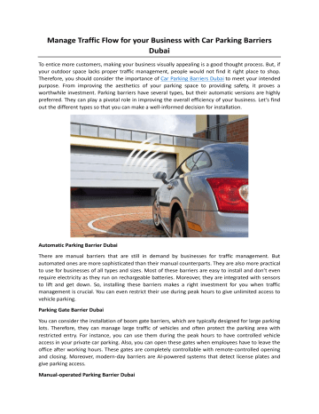 Manage Traffic Flow for your Business with Car Parking Barriers Dubai To entice more customers, making your business visually appealing is a good thought process. But, if your outdoor space lacks proper traffic management, people would not find it right place to shop. Therefore, you should consider the importance of Car Parking Barriers Dubai to meet your intended purpose. From improving the aesthetics of your parking space to providing safety, it proves a worthwhile investment. Parking barriers have several types, but their automatic versions are highly preferred. They can play a pivotal role in improving the overall efficiency of your business. Let’s find out the different types so that you can make a well-informed decision for installation. Automatic Parking Barrier Dubai There are manual barriers that are still in demand by businesses for traffic management. But automated ones are more sophisticated than their manual counterparts. They are also more practical to use for businesses of all types and sizes. Most of these barriers are easy to install and don’t even require electricity as they run on rechargeable batteries. Moreover, they are integrated with sensors to lift and get down. So, installing these barriers makes a right investment for you when traffic management is crucial. You can even restrict their use during peak hours to give unlimited access to vehicle parking. Parking Gate Barrier Dubai You can consider the installation of boom gate barriers, which are typically designed for large parking lots. Therefore, they can manage large traffic of vehicles and often protect the parking area with restricted entry. For instance, you can use them during the peak hours to have controlled vehicle access in your private car parking. Also, you can open these gates when employees have to leave the office after working hours. These gates are completely controllable with remote-controlled opening and closing. Moreover, modern-day barriers are AI-powered systems that detect license plates and give parking access. Manual-operated Parking Barrier Dubai Manual parking is most common in particular areas of Dubai shopping centers, businesses, and malls. They are the least expensive choice than that of automated ones. However, they might be difficult to operate every time because of manual operation. They are often installed in the concrete flooring, and one has to open and close them manually. These barriers also don’t require an electric connection for operation and come with a locking mechanism. Therefore, you can give access only to authorized vehicles to your parking area. However, these barriers are only good to use where there is less volume of traffic to manage. The Final Words It’s never too late to invest in good parking technology to build a professional image of your business. With the Automatic Parking Barrier Dubai installed by Maintenance UAE, you can effortlessly manage traffic. Even these systems are good for revenue collection if you want to make parking paid for your retail store or mall. This way, you can automate the entry and exit of vehicles as well as have a recognizable brand image.