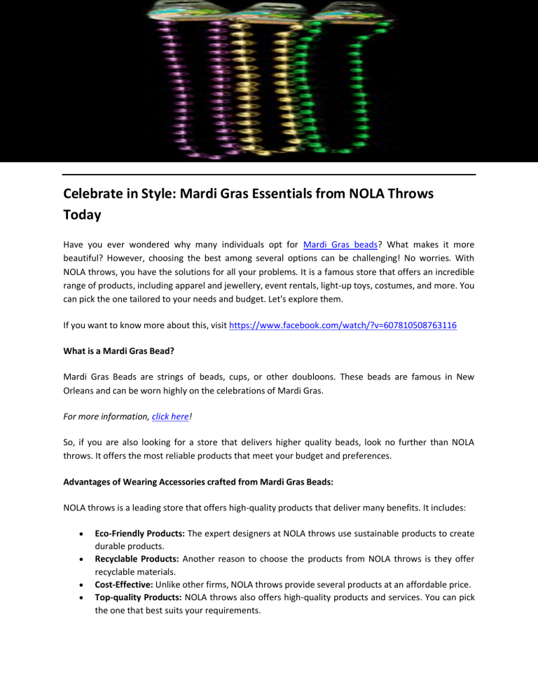 Celebrate in Style: Mardi Gras Essentials from NOLA Throws Today Have you ever wondered why many individuals opt for Mardi Gras beads? What makes it more beautiful? However, choosing the best among several options can be challenging! No worries. With NOLA throws, you have the solutions for all your problems. It is a famous store that offers an incredible range of products, including apparel and jewellery, event rentals, light-up toys, costumes, and more. You can pick the one tailored to your needs and budget. Let's explore them. If you want to know more about this, visit https://www.facebook.com/watch/?v=607810508763116 What is a Mardi Gras Bead? Mardi Gras Beads are strings of beads, cups, or other doubloons. These beads are famous in New Orleans and can be worn highly on the celebrations of Mardi Gras. For more information, click here! So, if you are also looking for a store that delivers higher quality beads, look no further than NOLA throws. It offers the most reliable products that meet your budget and preferences. Advantages of Wearing Accessories crafted from Mardi Gras Beads: NOLA throws is a leading store that offers high-quality products that deliver many benefits. It includes: Eco-Friendly Products: The expert designers at NOLA throws use sustainable products to create durable products. Recyclable Products: Another reason to choose the products from NOLA throws is they offer recyclable materials. Cost-Effective: Unlike other firms, NOLA throws provide several products at an affordable price. Top-quality Products: NOLA throws also offers high-quality products and services. You can pick the one that best suits your requirements. In conclusion, choosing products from NOLA throws offers several benefits. So, if you also want to purchase Mardi Gras throws, you can rely on this place. It provides high-quality products tailored to your needs and preferences. To know more, visit! Why Choose NOLA throws? Choosing products from NOLA throws can be beneficial in many ways. It is a leading store that delivers top-quality products at an affordable price, including: Light-up toys: LED swords, LED sunglasses, LED flowers, LED wands, LED headbands Masks and Costumes: Wigs, hats, headpieces Event Rentals: chairs, tables, tablecloth Mardi Gras Beads: light-up beads, bead bags, throw beads, glass and wood beads. Throws: Bags, backpacks, flowers, roses, umbrellas, tumblers, cups, sports balls Jewellery and Apparel: Accessories for men, women, and children In conclusion, these are some products offered by NOLA throws. So, if you are searching for the best Mardi Gras store, you can count on this platform. It delivers premium quality products at a cost-effective price that anyone can afford without hassle. To get more information, visit https://nolathrows.com/ Original Source: https://bit.ly/4kPSlSj