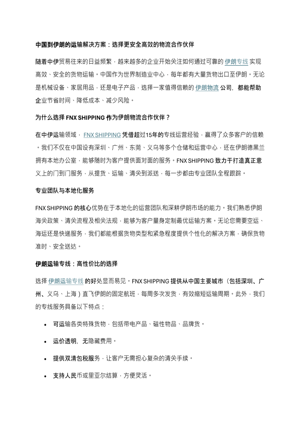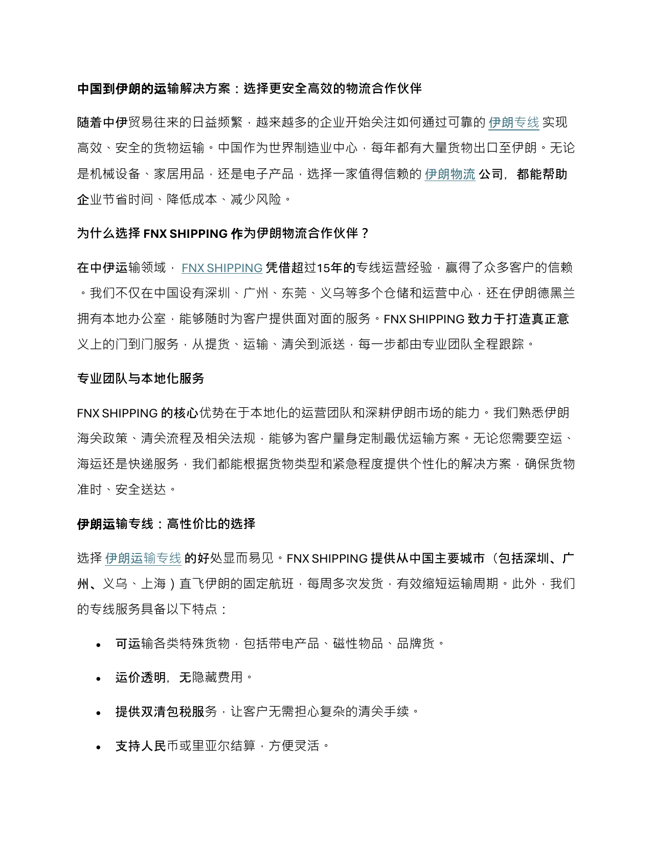 中国到伊朗的运输解决方案:选择更安全高效的物流合作伙伴 随着中伊贸易往来的日益频繁,越来越多的企业开始关注如何通过可靠的 伊朗专线 实现 高效、安全的货物运输。中国作为世界制造业中心,每年都有大量货物出口至伊朗。无论 是机械设备、家居用品,还是电子产品,选择一家值得信赖的 伊朗物流 公司,都能帮助 企业节省时间、降低成本、减少风险。 为什么选择 FNX SHIPPING 作为伊朗物流合作伙伴? 在中伊运输领域, FNX SHIPPING 凭借超过15年的专线运营经验,赢得了众多客户的信赖 。我们不仅在中国设有深圳、广州、东莞、义乌等多个仓储和运营中心,还在伊朗德黑兰 拥有本地办公室,能够随时为客户提供面对面的服务。FNX SHIPPING 致力于打造真正意 义上的门到门服务,从提货、运输、清关到派送,每一步都由专业团队全程跟踪。 专业团队与本地化服务 FNX SHIPPING 的核心优势在于本地化的运营团队和深耕伊朗市场的能力。我们熟悉伊朗 海关政策、清关流程及相关法规,能够为客户量身定制最优运输方案。无论您需要空运、 海运还是快递服务,我们都能根据货物类型和紧急程度提供个性化的解决方案,确保货物 准时、安全送达。 伊朗运输专线:高性价比的选择 选择 伊朗运输专线 的好处显而易见。FNX SHIPPING 提供从中国主要城市(包括深圳、广 州、义乌、上海)直飞伊朗的固定航班,每周多次发货,有效缩短运输周期。此外,我们 的专线服务具备以下特点: • 可运输各类特殊货物,包括带电产品、磁性物品、品牌货。 • 运价透明,无隐藏费用。 • 提供双清包税服务,让客户无需担心复杂的清关手续。 • 支持人民币或里亚尔结算,方便灵活。 伊朗清关服务:高效、安全、低成本 清关是跨境运输中最关键、最容易出问题的环节。FNX SHIPPING 拥有专业的清关团队, 能为客户提供快速、低成本的清关服务。我们承诺1至7个工作日内完成清关,代办所有 必要的清关许可证,帮助客户节省时间,避免因资料不全或操作不当而产生的高额滞港费 或罚款。 在 伊朗物流 清关领域,我们尤其擅长处理各类特殊货物的清关需求,并且在伊朗机场、 海运港口均设有合作代理,为客户打通从货物到港到最终派送的每一环节。 门到门运输服务:让跨境贸易更简单 作为首批在中伊之间提供真正门到门(DDP)服务的物流企业,FNX SHIPPING 能够为客 户解决整个运输过程中的繁琐事务。客户只需将货运单据交给我们,我们便会从中国工厂 或仓库上门提货,全程跟踪运输状态,直至货物安全送达伊朗收货方手中。 我们的门到门服务不仅免去客户在伊朗清关的烦恼,还能帮助客户显著降低运营成本和管 理风险。无论是中小企业还是大型进口商,都能从 FNX SHIPPING 的专业服务中受益。 选择 FNX SHIPPING 的更多理由 • 超过15年的中伊专线运输经验,服务稳定可靠。 • 中国和伊朗两地均有本地公司和团队,响应快速。 • 提供个性化物流方案,满足不同客户需求。 • 完善的售后服务体系,随时解答客户疑问。 • 高客户满意度,合作客户回头率高达95%以上。 客户案例与成功经验 FNX SHIPPING 已成功为数百家企业完成从中国到伊朗的跨境运输项目,包括电子产品批 量出口、机械设备整柜运输、化工产品小件空运等。我们帮助客户在最短时间内完成运输 和清关,助力其在伊朗市场快速建立竞争优势。 例如,某电子产品公司在选择 FNX SHIPPING 作为其 伊朗专线 物流合作伙伴后,平均运 输周期缩短了30%,年运输成本降低20%以上。此外,凭借我们的清关与派送能力,该公 司在德黑兰市场的订单履约率提升显著。 总结:选择专业,让跨境运输更高效 面对复杂多变的国际贸易环境,选择一家专业的 伊朗物流 公司,能够帮助您有效规避运 输风险、优化供应链流程。FNX SHIPPING 凭借丰富的经验、强大的本地资源以及专业的 服务团队,是您中伊跨境运输的不二之选。立即联系我们,获取您的专属物流方案,让中 伊贸易更简单高效。