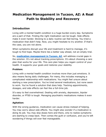 Medication Management in Tucson, AZ: A Real Path to Stability and Recovery Introduction Living with a mental health condition is a huge burden every day. Symptoms are a part of that. Finding the right medication can be tough. Side effects make it even harder. Sticking to a daily routine can feel boring. You tried a medication that didn’t help. Now, you might hesitate to try another. If that's the case, you are not alone. When symptoms disrupt your life and treatment is hard to manage, it’s tough to find hope. Maybe there lies a better way ahead, not an empty trial. So, medication management in Tucson, AZ, will address crucial gaps in the solution. It's not about tracking prescriptions. It's about choosing a care plan that works for your life. This care plan helps you regain control of your health. It supports your goals and restores your stability. Problem: Living with a mental health condition involves more than just emotions. It also means facing daily challenges. For many, this includes managing a complicated relationship with medications. You might feel unsure about starting a new prescription. You've tried several medications, but none seem to work. You’ve found a solution that does help. Tracking appointments, dosages, and side effects can feel like a full-time job. It’s easy to feel overwhelmed. Dealing with anxiety, depression, bipolar disorder, or PTSD is tough. Managing psychiatric medications makes it even harder. Agitation: With the wrong guidance, medication can cause stress instead of helping. You may worry about side effects. You might also wonder if a medication is doing its job. You may skip doses here and there, only to realize symptoms are starting to creep back. Then comes the guilt or confusion, and you’re left wondering if things will ever feel manageable. Solution: That’s where professional medication management in Tucson, AZ, comes into play. It’s not about handing out prescriptions. It’s about building a support system that’s focused on your needs, your body, and your life. Medication management helps individuals collaborate with licensed psychiatric providers. These providers learn about their history, symptoms, and goals. These experts do more than prescribe. They assess, adjust, educate, and support you through the ups and downs. What is medication management? Medication management is a comprehensive service. It includes evaluating, prescribing, and monitoring psychiatric medications. We carry out this process thoughtfully and consistently. The goal is to ensure that everyone gets the right medication at the right dose for their needs. It’s not a one-size-fits-all process. It’s a collaborative effort between the patient and provider. It starts with a thorough psychiatric evaluation. This helps the psychiatric providers to know about your symptoms and lifestyle. Then, based on that information, a tailored medication plan is created. But the process doesn’t stop there. You will have regular follow-up appointments. These check-ups help us see how the medication is working. We'll also track side effects and adjust the treatment if needed. Medication management is also about education. Providers explain the medication's purpose, side effects to watch for, and correct usage. It’s about giving you the confidence to manage your treatment with clarity and control. Who benefits from medication management? Managing your medication is key to recovery. This is especially true if you have a mental health condition and are thinking about medication. It can help people with: Depression Anxiety disorders Bipolar disorder PTSD Schizophrenia ADHD Mood and personality disorders Having a trained professional helps a lot. This is true if you're new to psychiatric treatment or have tried different methods for years. The Value of Working with Psychiatric Nurse Practitioners Quality medication management relies on providers, usually psychiatric nurse practitioners (PMHNPs) or psychiatrists. These professionals have specialized training in psychopharmacology and mental health care. Psychiatric nurse practitioners bring a unique approach to treatment. They often spend more time getting to know their patients, offering a more holistic view of care. They learn to spot patterns, ask better questions, and address more than symptoms. They focus on how medications impact your day-to-day life, not your diagnosis. What to Expect During Your Appointments At the start of medication management, you will receive a complete psychiatric evaluation. This may include: A discussion of your symptoms, how long they’ve been happening, and what seems to trigger them. A review of past medications—what helped, what didn’t, and any side effects you have experienced. A look at your physical health and any other medications you're taking. Lifestyle factors such as sleep, nutrition, stress, and substance use are important. Your treatment goals—what you hope to feel or achieve. Your provider will suggest a treatment plan. This may involve starting, stopping, or changing medications. Follow-up visits help you adjust your plan. They tackle any concerns and ensure your treatment meets your needs. Why Local Matters: Getting Medication Management. For local medication management, look for someone who knows the community and its resources. Local providers understand the regional healthcare system. They know about support services available in the area. Plus, they are aware of cultural and environmental stressors. This local knowledge can improve communication, treatment planning, and follow-up care. Staying close to home helps you keep appointments, pick up prescriptions, and connect with your treatment team. Conclusion: A Realistic, Supported Way Forward Taking care of your mental health is hard work. But you don’t have to do it alone—and you don’t have to guess your way through it. Medication management is a clear and structured way to find the right treatment for you. It also e