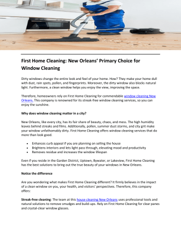 First Home Cleaning: New Orleans’ Primary Choice for Window Cleaning Dirty windows change the entire look and feel of your home. How? They make your home dull with dust, rain spots, pollen, and fingerprints. Moreover, the dirty window also blocks natural light. Furthermore, a clean window helps you enjoy the view, improving the space. Therefore, homeowners rely on First Home Cleaning for commendable window cleaning New Orleans. This company is renowned for its streak-free window cleaning services, so you can enjoy the sunshine. Why does window cleaning matter in a city? New Orleans, like every city, has its fair share of beauty, chaos, and mess. The high humidity leaves behind streaks and films. Additionally, pollen, summer dust storms, and city grit make your window unfathomably dirty. First Home Cleaning offers window cleaning services that do more than look good. Enhances curb appeal if you are planning on selling the house Brightens interiors and lets light pass through, elevating mood and productivity Removes residue and increases the window lifespan Even if you reside in the Garden District, Uptown, Bywater, or Lakeview, First Home Cleaning has the best solutions to bring out the true beauty of your windows in New Orleans. Notice the difference Are you wondering what makes First Home Cleaning different? It firmly believes in the impact of a clean window on you, your health, and visitors’ perspectives. Therefore, this company offers: Streak-free cleaning: The team at this house cleaning New Orleans uses professional tools and natural solutions to remove smudges and build-ups. Rely on First Home Cleaning for clear panes and crystal-clear window glasses. Cleaning inside and out: First Home Cleaning cleans every nook and corner with care, including hard-to-reach spaces and special panes. You can call the team for cleaning frames, screens, and sills. Flexible scheduling and transparent pricing: Are you searching for a one-time cleaning, seasonal window washing, or recurring services? You can schedule a call with the experts based on your needs and availability. The team respectfully enters your home and completes the job with precision and care. Perfect for every occasion Are you hosting Mardi Gras, fests, family gatherings, or holidays? Trust First Home Cleaning to leave a lasting first impression on your guests. Or are you tired of the consistent dirt and grime accumulation on the window? Just call the team and be stress-free about window cleaning. Homeowners trust First Home Cleaning for its reliable cleaning services New Orleans. To get more details, visit https://www.firsthomecleaning.com/