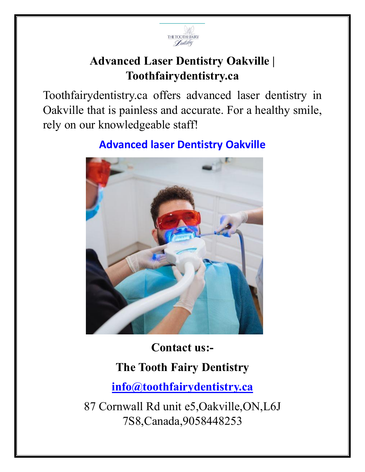 Advanced Laser Dentistry Oakville | Toothfairydentistry.ca Toothfairydentistry.ca offers advanced laser dentistry in Oakville that is painless and accurate. For a healthy smile, rely on our knowledgeable staff! Advanced laser Dentistry Oakville Contact us:The Tooth Fairy Dentistry [email protected] 87 Cornwall Rd unit e5,Oakville,ON,L6J 7S8,Canada,9058448253