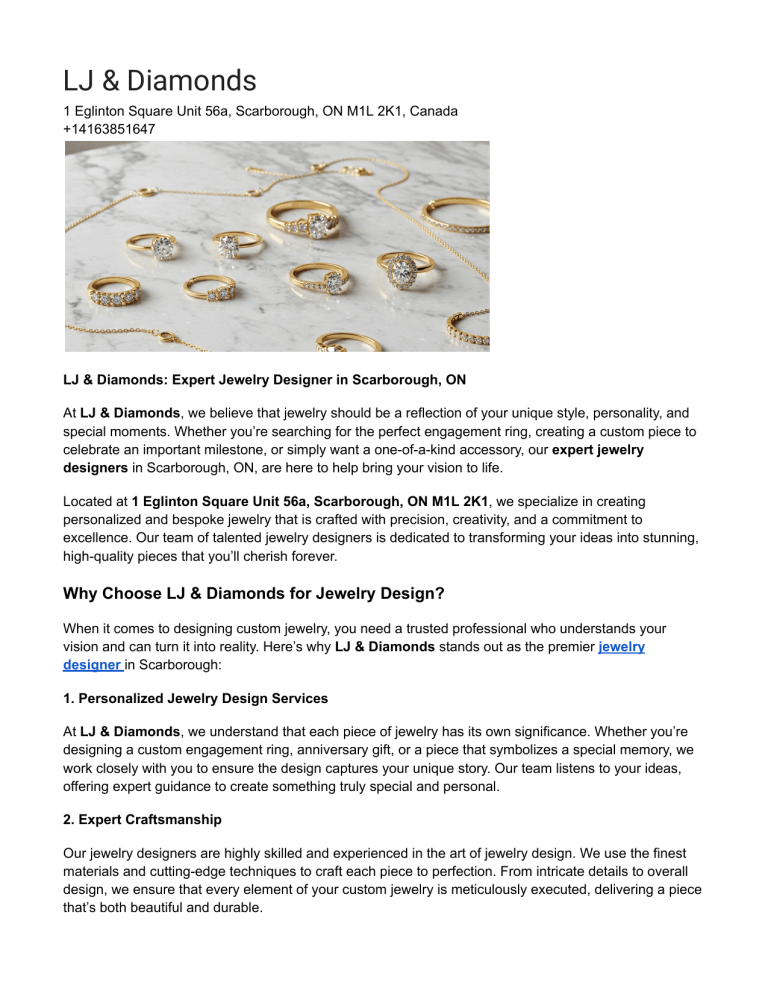 LJ & Diamonds 1 Eglinton Square Unit 56a, Scarborough, ON M1L 2K1, Canada +14163851647 LJ & Diamonds: Expert Jewelry Designer in Scarborough, ON At LJ & Diamonds, we believe that jewelry should be a reflection of your unique style, personality, and special moments. Whether you’re searching for the perfect engagement ring, creating a custom piece to celebrate an important milestone, or simply want a one-of-a-kind accessory, our expert jewelry designers in Scarborough, ON, are here to help bring your vision to life. Located at 1 Eglinton Square Unit 56a, Scarborough, ON M1L 2K1, we specialize in creating personalized and bespoke jewelry that is crafted with precision, creativity, and a commitment to excellence. Our team of talented jewelry designers is dedicated to transforming your ideas into stunning, high-quality pieces that you’ll cherish forever. Why Choose LJ & Diamonds for Jewelry Design? When it comes to designing custom jewelry, you need a trusted professional who understands your vision and can turn it into reality. Here’s why LJ & Diamonds stands out as the premier jewelry designer in Scarborough: 1. Personalized Jewelry Design Services At LJ & Diamonds, we understand that each piece of jewelry has its own significance. Whether you’re designing a custom engagement ring, anniversary gift, or a piece that symbolizes a special memory, we work closely with you to ensure the design captures your unique story. Our team listens to your ideas, offering expert guidance to create something truly special and personal. 2. Expert Craftsmanship Our jewelry designers are highly skilled and experienced in the art of jewelry design. We use the finest materials and cutting-edge techniques to craft each piece to perfection. From intricate details to overall design, we ensure that every element of your custom jewelry is meticulously executed, delivering a piece that’s both beautiful and durable. 3. Wide Range of Customization Options At LJ & Diamonds, we offer a variety of customization options for your jewelry. Whether it’s choosing the type of metal (gold, platinum, silver), selecting gemstones (diamonds, sapphires, rubies, etc.), or deciding on a specific design style, our designers will guide you through every option to create a piece that reflects your personal taste and preferences. 4. Engagement Rings and Wedding Bands Looking to propose? Our engagement rings are designed with the highest level of craftsmanship and attention to detail. Whether you’re looking for a timeless solitaire, a vintage-inspired design, or a unique setting with diamonds or colored gemstones, we create rings that symbolize your love story. We also specialize in custom wedding bands, ensuring a perfect match for your engagement ring. 5. High-Quality Materials At LJ & Diamonds, we work with only the finest materials to craft your custom jewelry. Whether it's high-quality gold, platinum, or precious gemstones, we source the best materials to ensure your jewelry is not only stunning but also durable and lasting. 6. Collaborative Design Process Designing custom jewelry is a collaborative process, and we pride ourselves on making it easy and enjoyable. Our jewelry designer https://maps.app.goo.gl/S1VcnMk2xUGZcUF96 take the time to understand your ideas and preferences, guiding you through each step, from the initial concept to the final creation. You’ll be involved in the process, ensuring the finished piece is exactly what you imagined. 7. Timely Delivery We understand that custom jewelry is often made for special occasions, and we strive to deliver your piece within a reasonable timeframe without compromising on quality. Whether it’s a last-minute engagement ring or a custom anniversary gift, we work efficiently to bring your design to life in a timely manner. Visit Us for Your Custom Jewelry Design If you’re ready to create the jewelry of your dreams, look no further than LJ & Diamonds. Our expert jewelry designers are here to turn your ideas into reality with a focus on quality, creativity, and personal service. We work closely with each client to ensure that every piece we create is a perfect reflection of their unique vision. Stop by LJ & Diamonds at 1 Eglinton Square Unit 56a, Scarborough, ON M1L 2K1, or call us at +1 416-385-1647 to discuss your custom jewelry design project.