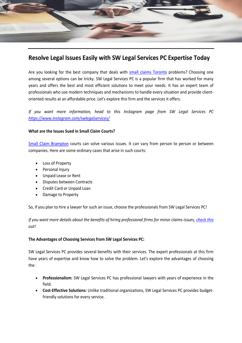 Resolve Legal Issues Easily with SW Legal Services PC Expertise Today Are you looking for the best company that deals with small claims Toronto problems? Choosing one among several options can be tricky. SW Legal Services PC is a popular firm that has worked for many years and offers the best and most efficient solutions to meet your needs. It has an expert team of professionals who use modern techniques and mechanisms to handle every situation and provide clientoriented results at an affordable price. Let's explore this firm and the services it offers. If you want more information, head to this Instagram page from SW Legal Services PC https://www.instagram.com/swlegalservices/ What are the Issues Sued in Small Claim Courts? Small Claim Brampton courts can solve various issues. It can vary from person to person or between companies. Here are some ordinary cases that arise in such courts: Loss of Property Personal Injury Unpaid Lease or Rent Disputes between Contracts Credit Card or Unpaid Loan Damage to Property So, if you plan to hire a lawyer for such an issue, choose the professionals from SW Legal Services PC! If you want more details about the benefits of hiring professional firms for minor claims issues, check this out! The Advantages of Choosing Services from SW Legal Services PC: SW Legal Services PC provides several benefits with their services. The expert professionals at this firm have years of expertise and know how to solve the problem. Let's explore the advantages of choosing the: Professionalism: SW Legal Services PC has professional lawyers with years of experience in the field. Cost-Effective Solutions: Unlike traditional organizations, SW Legal Services PC provides budgetfriendly solutions for every service. In-Depth Research: SW Legal Services PC delivers notch-quality services with depth-research solutions. In conclusion, hiring professionals from SW Legal Services PC offers many benefits over traditional firms. To know more, head to https://swlegalservices.ca/3-hearing-methods-used-by-the-court-for-smallclaims-cases/ Contact SW Legal Services PC for more details! Why Trust SW Legal Services PC? SW Legal Services PC is a leading firm that offers the best paralegal Toronto and many other services. The expert professionals at this firm specialize in several services, including: Small Claims Landlord and Tenant Hunting and Fishing Criminal Activities Traffic Tickets These are some popular services delivered by this organization. Visit this for more information. If you want to opt for any, you can count on SW Legal Services PC. To get more information, visit https://swlegalservices.ca/ Contact no.: 905-235-4567 Email: [email protected] Original Source: https://bit.ly/4njCKf4