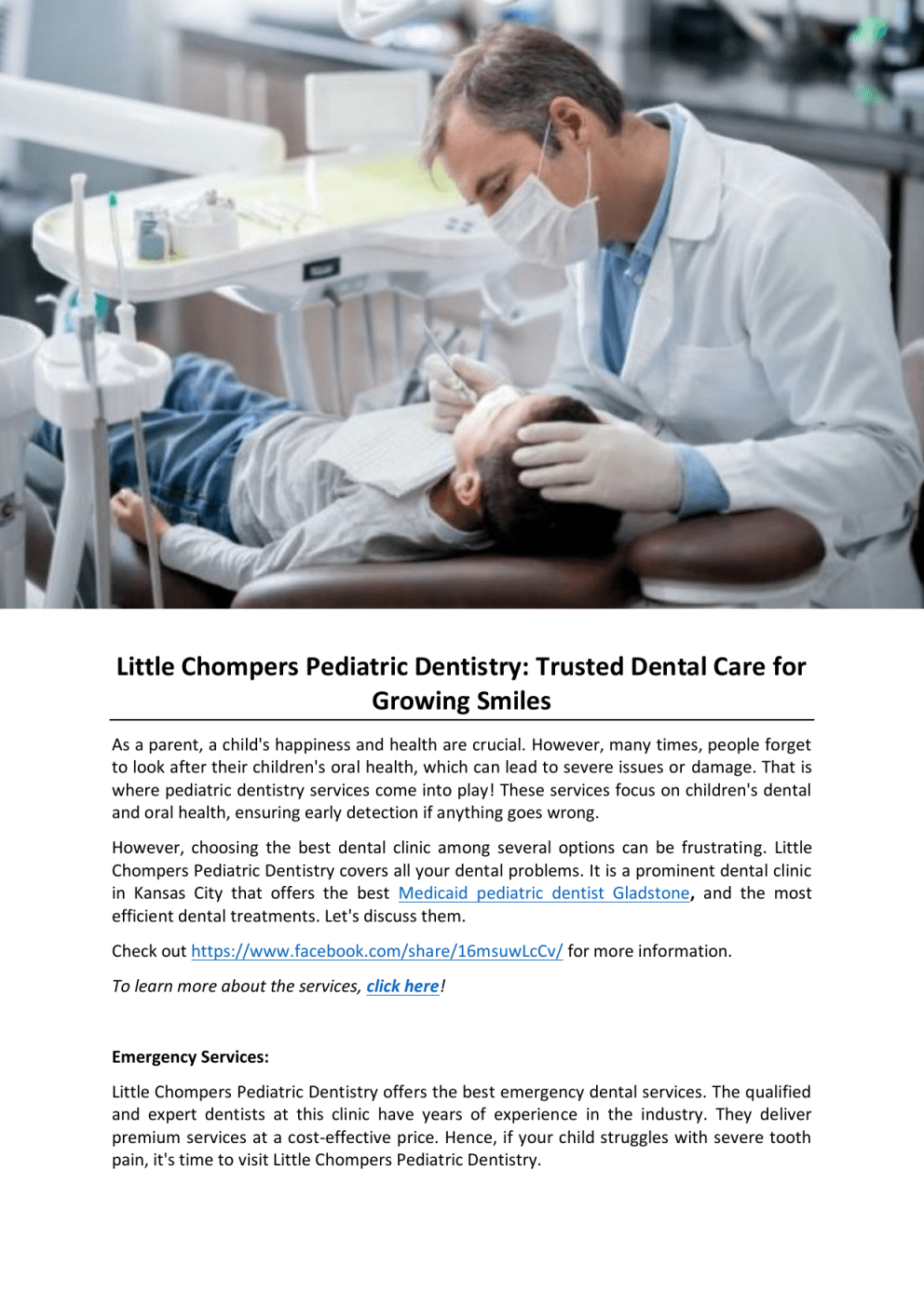 Little Chompers Pediatric Dentistry: Trusted Dental Care for Growing Smiles As a parent, a child's happiness and health are crucial. However, many times, people forget to look after their children's oral health, which can lead to severe issues or damage. That is where pediatric dentistry services come into play! These services focus on children's dental and oral health, ensuring early detection if anything goes wrong. However, choosing the best dental clinic among several options can be frustrating. Little Chompers Pediatric Dentistry covers all your dental problems. It is a prominent dental clinic in Kansas City that offers the best Medicaid pediatric dentist Gladstone, and the most efficient dental treatments. Let's discuss them. Check out https://www.facebook.com/share/16msuwLcCv/ for more information. To learn more about the services, click here! Emergency Services: Little Chompers Pediatric Dentistry offers the best emergency dental services. The qualified and expert dentists at this clinic have years of experience in the industry. They deliver premium services at a cost-effective price. Hence, if your child struggles with severe tooth pain, it's time to visit Little Chompers Pediatric Dentistry. Pediatric Dentistry: If you are searching for Medicaid pediatric dentist Tiffany Springs services, look no further than Little Chompers Pediatric Dentistry. It is a famous clinic with experienced dentists. They stay updated on the latest techniques to deliver tailored solutions at an affordable price. Opt for their services to receive the most favorable results. Post-op Care: Little Chompers Pediatric Dentistry provides the best recommendations from expert dentists to build a healthy habit. They focus on dental hygiene, personalized extraction aftercare, and post-op care to ensure long-lasting and smooth recovery of oral health. Choose their services to get the most astonishing outcomes. For more details, click here! Why Choose Little Chompers Pediatric Dentistry? Little Chompers Pediatric Dentistry is a famous dental clinic that offers top-quality dental services to children of all ages. Here are some reasons why opting for Little Chompers Pediatric Dentistry services: It has an expert team of pediatric dentist Kansas City. They have experience in several fields, including childcare, oral hygiene, emergency needs, and more. The professional dentists at Little Chompers Pediatric Dentistry possess the tools and equipment to provide a healthy and beautiful smile. Little Chompers Pediatric Dentistry offers cost-effective solutions. Anyone can easily opt for them without hassle. To know more, visit https://littlechomperspd.com/howdentists-ensure-a-seamless-experience-for-children-with-special-needs/. So, what are you waiting for? Opt for Little Chompers Pediatric Dentistry services today for your child and enjoy the best and most efficient solutions tailored to your needs. To get more information, visit https://littlechomperspd.com/ Contact no.: (816) 957-1023 Original Source: https://bit.ly/440sSQ7