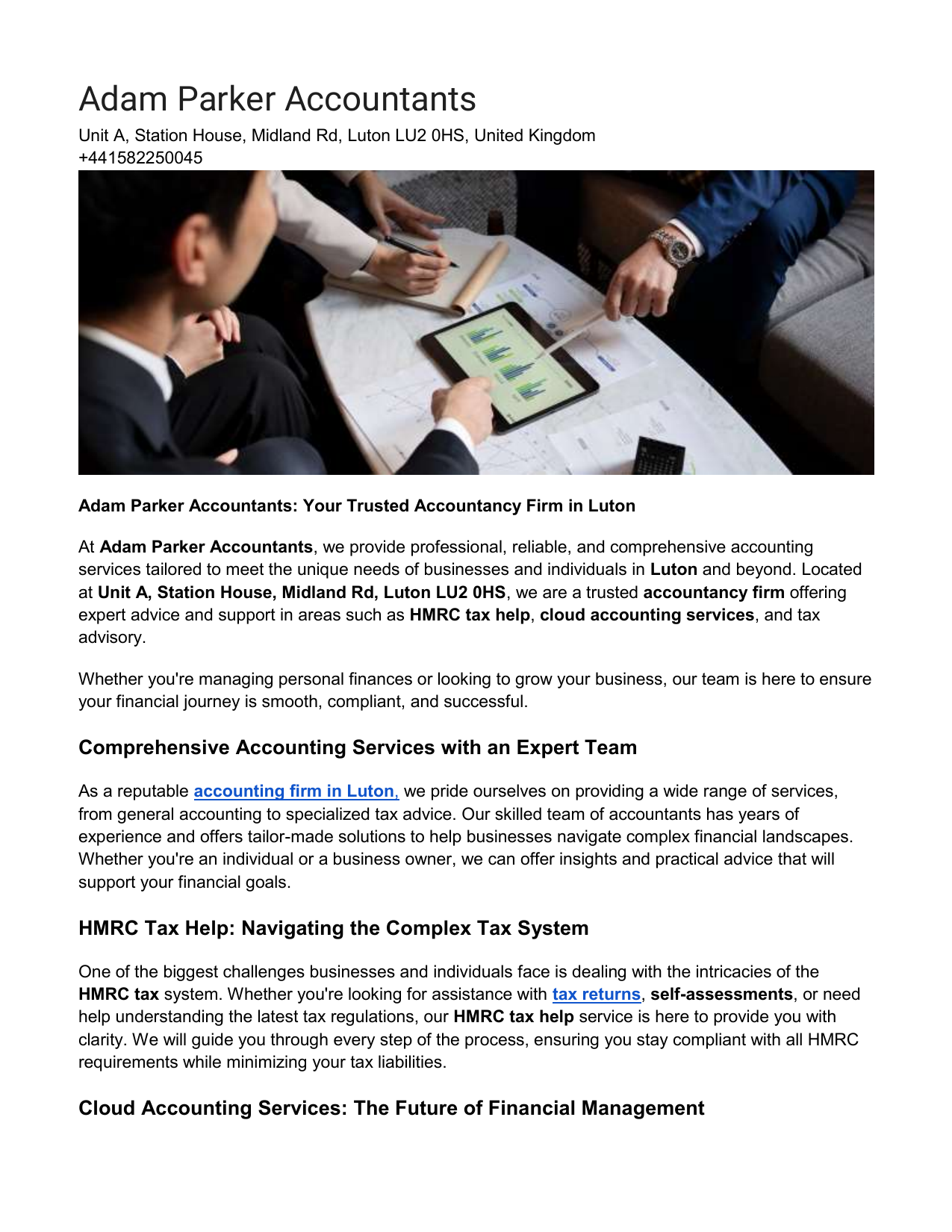 Adam Parker Accountants Unit A, Station House, Midland Rd, Luton LU2 0HS, United Kingdom +441582250045 Adam Parker Accountants: Your Trusted Accountancy Firm in Luton At Adam Parker Accountants, we provide professional, reliable, and comprehensive accounting services tailored to meet the unique needs of businesses and individuals in Luton and beyond. Located at Unit A, Station House, Midland Rd, Luton LU2 0HS, we are a trusted accountancy firm offering expert advice and support in areas such as HMRC tax help, cloud accounting services, and tax advisory. Whether you're managing personal finances or looking to grow your business, our team is here to ensure your financial journey is smooth, compliant, and successful. Comprehensive Accounting Services with an Expert Team As a reputable accounting firm in Luton, we pride ourselves on providing a wide range of services, from general accounting to specialized tax advice. Our skilled team of accountants has years of experience and offers tailor-made solutions to help businesses navigate complex financial landscapes. Whether you're an individual or a business owner, we can offer insights and practical advice that will support your financial goals. HMRC Tax Help: Navigating the Complex Tax System One of the biggest challenges businesses and individuals face is dealing with the intricacies of the HMRC tax system. Whether you're looking for assistance with tax returns, self-assessments, or need help understanding the latest tax regulations, our HMRC tax help service is here to provide you with clarity. We will guide you through every step of the process, ensuring you stay compliant with all HMRC requirements while minimizing your tax liabilities. Cloud Accounting Services: The Future of Financial Management In today's fast-paced world, cloud accounting services have become a game-changer for businesses. At Adam Parker Accountants, we offer innovative cloud-based accounting solutions that allow you to manage your finances from anywhere, anytime. With real-time access to your financial data, you can make informed decisions, track your business performance, and stay ahead of the competition. Our cloud accounting services ensure your financial records are secure, accurate, and always up-to-date. Your Local Accountant in Luton Finding the right accountant in Luton can make a significant difference in the way you manage your finances. Whether you're a small business owner or an individual seeking tax advice, Adam Parker Accountants offers local, expert service you can rely on. We understand the unique needs of the Luton community, and our team is dedicated to helping you achieve financial success, no matter your goals. Tax Advisor Luton: Personalized Tax Advice Navigating the world of taxes can be overwhelming, but with the support of a qualified tax advisor in Luton, you can rest assured that you're on the right track. At Adam Parker Accountants, our tax advisors provide personalized advice that is specifically tailored to your financial situation. From minimizing tax liabilities to ensuring you're taking advantage of all available tax breaks, our team is here to guide you through the ever-changing tax landscape. Why Choose Adam Parker Accountants? ● Expertise and Experience: As an established accountancy firm in Luton, our team has the knowledge and experience to provide comprehensive accounting solutions for businesses and individuals alike. ● HMRC Tax Help: We offer expert guidance to help you navigate the complexities of the HMRC tax system, ensuring compliance and minimizing tax risks. ● Cloud Accounting: Our innovative cloud accounting services make managing your finances easier, faster, and more efficient, allowing you to make informed decisions wherever you are. ● Local and Trusted: We are a locally-based accounting firm in Luton, committed to supporting businesses and individuals in our community. ● Personalized Service: Our tax advisors offer tailored solutions to ensure your tax planning and financial management are optimized for your unique needs. For more information about our accounting firm in Luton, HMRC tax help, cloud accounting services, or to schedule a consultation with our tax advisor in Luton, contact Adam Parker Accountants today at +44 1582 250045. Let us help you take control of your financial future with the expertise and support you need.