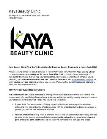 KayaBeauty Clinic 85 Wigram St, Harris Park NSW 2150, Australia +61448075555 Kaya Beauty Clinic: Your Go-To Destination for Premium Beauty Treatments in Harris Park, NSW Are you looking for top-tier beauty services in Harris Park? Look no further than Kaya Beauty Clinic! Located conveniently at 85 Wigram St, Harris Park NSW 2150, our clinic offers a wide range of high-quality treatments that will help you feel refreshed, rejuvenated, and confident. Whether you're searching for a microdermabrasion near me, chemical peels near me, acne treatment near me, or even waxing services near me, we have you covered. Plus, we offer keratin treatments near me to keep your hair healthy and shiny. Why Choose Kaya Beauty Clinic? At Kaya Beauty Clinic, we’re dedicated to offering personalized beauty treatments that cater to your unique needs. Our certified professionals use advanced techniques and high-quality products to ensure your satisfaction with every visit. Here’s why you should choose us: 1. Expert Staff: Our team consists of highly trained professionals who are passionate about enhancing your natural beauty. We stay updated with the latest beauty trends and techniques to provide you with the best treatments available. 2. Tailored Treatments: Every client is different, which is why we offer customized beauty services. Whether you're seeking a deep exfoliation with microdermabrasion, a rejuvenating chemical peel, or targeted acne treatments, we will tailor the service to your skin type and needs. 3. Convenient Location: Located in the heart of Harris Park, we are easily accessible to residents and visitors alike. We offer flexible hours to fit your busy schedule. 4. Comprehensive Services: From waxing services to keratin treatments for shiny, smooth hair, Kaya Beauty Clinic is your one-stop shop for all things beauty. Our goal is to make sure you feel pampered from head to toe. 5. State-of-the-Art Equipment: We use only the best equipment and the latest technology to ensure that your treatments are both effective and safe. Our Services 1. Microdermabrasion Near Me: Microdermabrasion is a non-invasive skin resurfacing procedure that gently exfoliates your skin, removing dead cells and leaving your skin looking fresh and youthful. It helps reduce the appearance of fine lines, age spots, and acne scars. If you’re searching for microdermabrasion near me, we offer affordable and effective treatments that will leave your skin glowing. 2. Chemical Peels Near Me: Chemical peels are an excellent way to refresh your skin by removing dead skin cells and promoting new cell growth. Whether you're dealing with pigmentation, acne, or fine lines, our chemical peel treatments can revitalize your complexion. Looking for chemical peels near me? Visit Kaya Beauty Clinic for a professional treatment tailored to your skin. 3. Acne Treatment Near Me: Acne can affect anyone, regardless of age, but we offer effective treatments that target breakouts and prevent future flare-ups. Our acne treatments are customized to your skin’s specific needs, helping you achieve a clear and healthy complexion. Say goodbye to acne by scheduling an appointment for acne treatment near me at Kaya Beauty Clinic. 4. Waxing Services Near Me: Our waxing services near me provide smooth, hair-free skin that lasts longer than shaving. We use high-quality wax for all skin types to ensure a comfortable and effective experience. From eyebrow shaping to full body waxing, we ensure precision and minimal discomfort. 5. Keratin Treatments Near Me: For those looking to get their hair smooth and shiny, our keratin treatments near me offer a long-lasting solution. Keratin treatments help reduce frizz and add shine, leaving your hair sleek and manageable. Visit Kaya Beauty Clinic for the best keratin treatments that will transform your hair. Contact Us If you're looking for a beauty clinic near me in Harris Park, Kaya Beauty Clinic is here to provide you with the best in beauty and skincare. Our team of experts is dedicated to helping you look and feel your best. Location: 85 Wigram St, Harris Park NSW 2150, Australia Contact Number: +61448075555 For bookings or inquiries, feel free to call us or send us a message. We can’t wait to help you achieve the beauty and confidence you deserve! Book Your Appointment Today! At Kaya Beauty Clinic, we make your beauty and skincare goals our priority. Whether you're after a microdermabrasion, chemical peel, acne treatment, waxing, or keratin treatment, our team is ready to help you look and feel your best. Book your appointment today and experience beauty like never before!