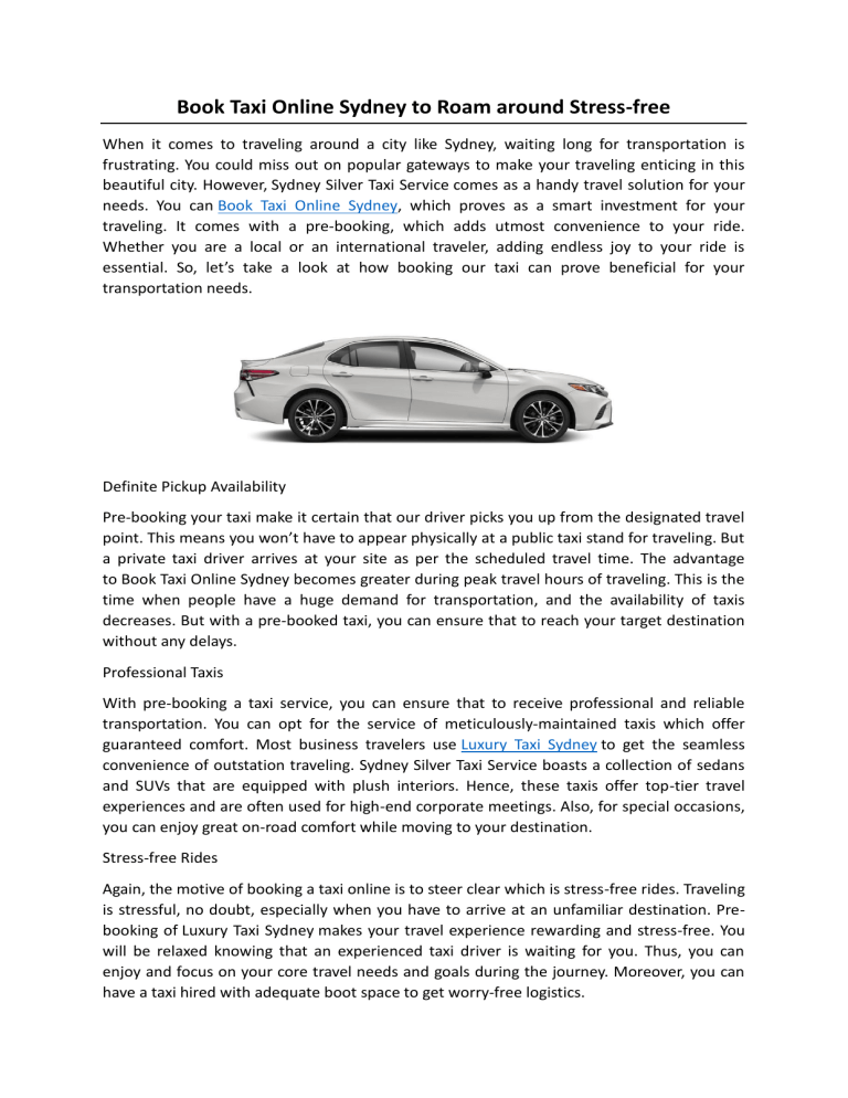 Book Taxi Online Sydney to Roam around Stress-free When it comes to traveling around a city like Sydney, waiting long for transportation is frustrating. You could miss out on popular gateways to make your traveling enticing in this beautiful city. However, Sydney Silver Taxi Service comes as a handy travel solution for your needs. You can Book Taxi Online Sydney, which proves as a smart investment for your traveling. It comes with a pre-booking, which adds utmost convenience to your ride. Whether you are a local or an international traveler, adding endless joy to your ride is essential. So, let’s take a look at how booking our taxi can prove beneficial for your transportation needs. Definite Pickup Availability Pre-booking your taxi make it certain that our driver picks you up from the designated travel point. This means you won’t have to appear physically at a public taxi stand for traveling. But a private taxi driver arrives at your site as per the scheduled travel time. The advantage to Book Taxi Online Sydney becomes greater during peak travel hours of traveling. This is the time when people have a huge demand for transportation, and the availability of taxis decreases. But with a pre-booked taxi, you can ensure that to reach your target destination without any delays. Professional Taxis With pre-booking a taxi service, you can ensure that to receive professional and reliable transportation. You can opt for the service of meticulously-maintained taxis which offer guaranteed comfort. Most business travelers use Luxury Taxi Sydney to get the seamless convenience of outstation traveling. Sydney Silver Taxi Service boasts a collection of sedans and SUVs that are equipped with plush interiors. Hence, these taxis offer top-tier travel experiences and are often used for high-end corporate meetings. Also, for special occasions, you can enjoy great on-road comfort while moving to your destination. Stress-free Rides Again, the motive of booking a taxi online is to steer clear which is stress-free rides. Traveling is stressful, no doubt, especially when you have to arrive at an unfamiliar destination. Prebooking of Luxury Taxi Sydney makes your travel experience rewarding and stress-free. You will be relaxed knowing that an experienced taxi driver is waiting for you. Thus, you can enjoy and focus on your core travel needs and goals during the journey. Moreover, you can have a taxi hired with adequate boot space to get worry-free logistics. Have Convenient Airport Transfers Sydney with Us You can get the convenience of reaching at airport with a pre-booked taxi service. It gives you the flexibility of transportation to board your flight as per schedule. It lets you plan your travel without worrying about missing the flight to your intended destination. It even comes with flexibility to alter your schedule as per your needs in the event of a flight delay or cancellation. Sydney Silver Taxi Service makes necessary adjustments as per the requirements. Thus, making your Airport Transfers Sydney a seamless experience. You can book this service for a one-way or round-trip to reach your destination. Book a Silver Taxi Sydney Airport fleet from your comfort Now, you don’t need to visit the offices of taxi operators to book a cab for airport travel. Digital technology has surpassed the level of convenience for travelers with online taxi reservations. So, you can find a suitable airport taxi without putting yourself through any physical effort. Just run your fingers on your desktop or mobile for the Silver Taxi Sydney Airport service in a few minutes. This alleviates your stress of finding an appropriate cab to make the airport journey convenient and fast. Leverage the opportunity of choosing a compact, sedan, SUV, or maxi taxi fleet for travel. Get Transparent Pricing for Sydney Airport Taxi Service When you consider to Book Taxi Online in Sydney, it prevents you from paying overcharges. The flat-rate pricing policy of Sydney Silver Taxi Service eliminates instances of fluctuating charges. This creates a seamless travel experience for you from beginning to end. There is no guessing game and no last-minute surprises involved in traveling. Just straightforward pricing structure is available for you to book the journey. Fixed pricing of your airport cab evades the unpredictability related to fluctuating travel costs. Even you don’t have to worry about skyrocketing charges during peak hours.