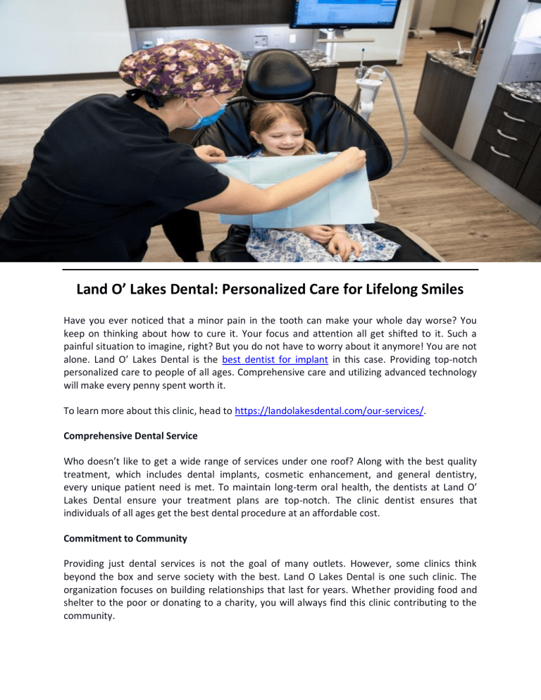 Land O’ Lakes Dental: Personalized Care for Lifelong Smiles Have you ever noticed that a minor pain in the tooth can make your whole day worse? You keep on thinking about how to cure it. Your focus and attention all get shifted to it. Such a painful situation to imagine, right? But you do not have to worry about it anymore! You are not alone. Land O’ Lakes Dental is the best dentist for implant in this case. Providing top-notch personalized care to people of all ages. Comprehensive care and utilizing advanced technology will make every penny spent worth it. To learn more about this clinic, head to https://landolakesdental.com/our-services/. Comprehensive Dental Service Who doesn’t like to get a wide range of services under one roof? Along with the best quality treatment, which includes dental implants, cosmetic enhancement, and general dentistry, every unique patient need is met. To maintain long-term oral health, the dentists at Land O’ Lakes Dental ensure your treatment plans are top-notch. The clinic dentist ensures that individuals of all ages get the best dental procedure at an affordable cost. Commitment to Community Providing just dental services is not the goal of many outlets. However, some clinics think beyond the box and serve society with the best. Land O Lakes Dental is one such clinic. The organization focuses on building relationships that last for years. Whether providing food and shelter to the poor or donating to a charity, you will always find this clinic contributing to the community. Preventive Care Preventive care is necessary for maintaining dental health for a long time. It includes regular cleaning, check-ups, and following a dental care routine. All these things contribute to catching and resolving the problem before it becomes a serious issue. Land O’ Lakes Dental ensures you and your family get the best after-service and expert guidance to maintain oral health. Whether you want a general cleaning of your teeth or need the best implant dentists, this clinic has got you covered. Timely Work Land O’ Lakes Dental can provide you with the decided timeline for any dental treatment, from initial consultation to final recovery. Their professional team will complete the dental treatment on time without any hustle and bustle. Visit them and get the treatments done on your appointment date. If you are searching for a Invisalign near me, you can check out Land O’ Lakes Dental and book an appointment by visiting its website. To get help from this cosmetic dental clinic, visit https://landolakesdental.com/ Original Source: https://bit.ly/4436p4Y