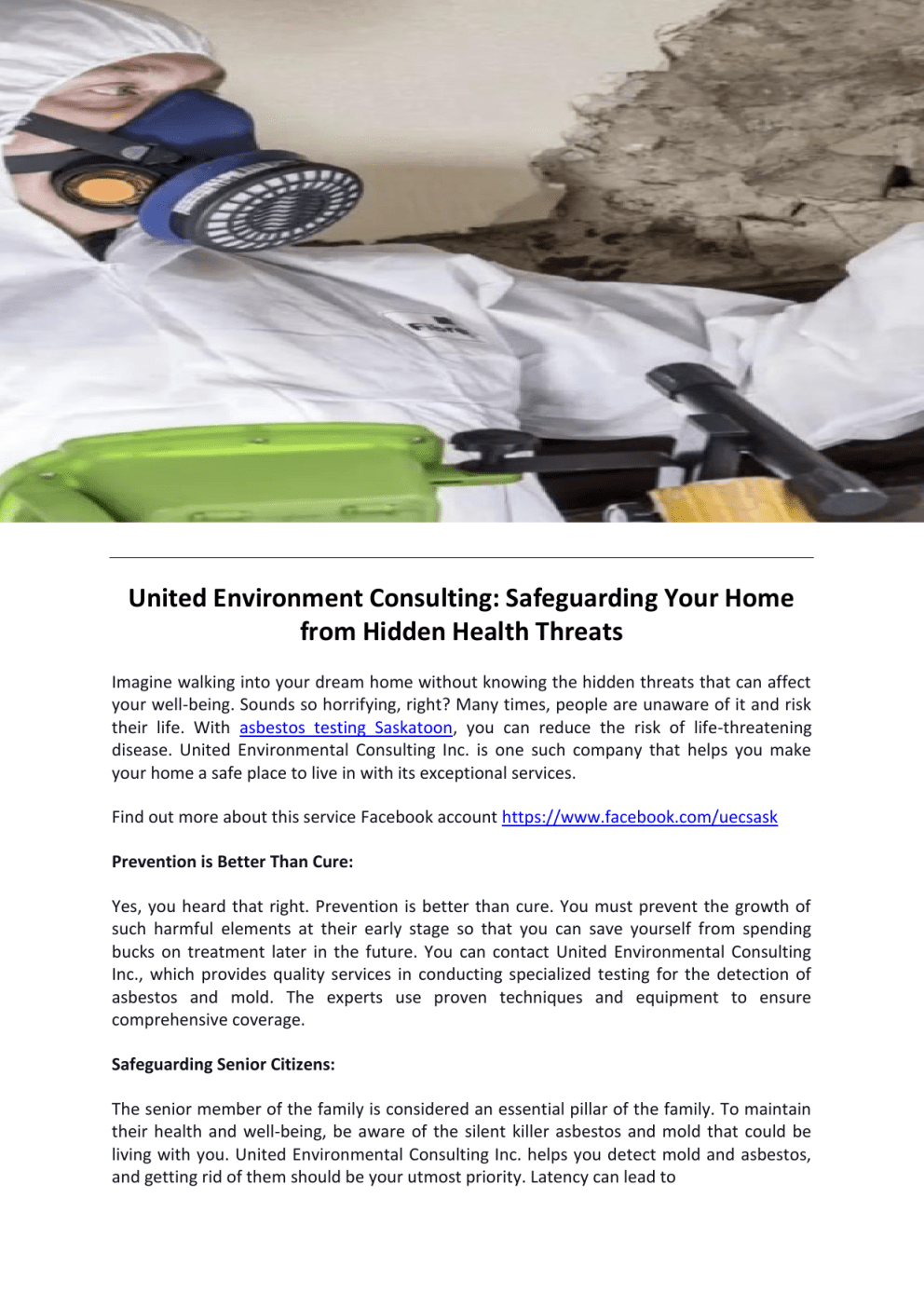 United Environment Consulting: Safeguarding Your Home from Hidden Health Threats Imagine walking into your dream home without knowing the hidden threats that can affect your well-being. Sounds so horrifying, right? Many times, people are unaware of it and risk their life. With asbestos testing Saskatoon, you can reduce the risk of life-threatening disease. United Environmental Consulting Inc. is one such company that helps you make your home a safe place to live in with its exceptional services. Find out more about this service Facebook account https://www.facebook.com/uecsask Prevention is Better Than Cure: Yes, you heard that right. Prevention is better than cure. You must prevent the growth of such harmful elements at their early stage so that you can save yourself from spending bucks on treatment later in the future. You can contact United Environmental Consulting Inc., which provides quality services in conducting specialized testing for the detection of asbestos and mold. The experts use proven techniques and equipment to ensure comprehensive coverage. Safeguarding Senior Citizens: The senior member of the family is considered an essential pillar of the family. To maintain their health and well-being, be aware of the silent killer asbestos and mold that could be living with you. United Environmental Consulting Inc. helps you detect mold and asbestos, and getting rid of them should be your utmost priority. Latency can lead to Cost Effective Solution: What if you could achieve long-term peace of mind with a one-time investment? However, a property with a history of asbestos and mold issues can witness a 15 to 20% decrease in the valuation for sale. No one wants this situation to happen in the future. The asbestos training Regina is your savior in that case. United Environmental Consulting Inc. ensures you get reasonable services at an affordable price. The professionals contribute to the safety establishment within your living space. Stress-Free Lease Agreements: When you plan to lease out your property, ensure that it is free from hazardous substances. To ensure a positive renting experience, prioritizing asbestos testing is essential. United Environmental Consulting Inc. is one of the leading asbestos and mold testing services. It provides mould testing Saskatoon, and asbestos abatement air monitoring. Their past projects mainly cover homes, commercial buildings, schools, hospitals, small buildings, and testing and monitoring services for hazardous elements. For the last 18 years, it has been serving people in Regina and Saskatoon with its commendable services. So, call this expert service now! For more details, contact https://www.ueconsulting.ca/ Original Source https://bit.ly/44nWBRL
