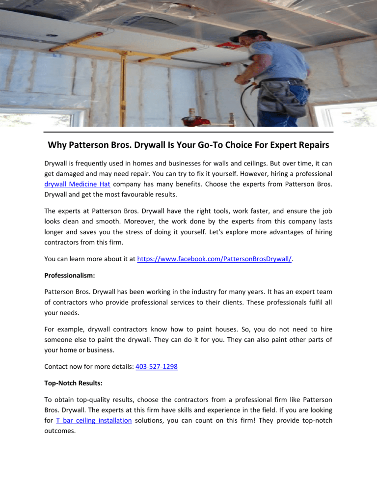 Why Patterson Bros. Drywall Is Your Go-To Choice For Expert Repairs Drywall is frequently used in homes and businesses for walls and ceilings. But over time, it can get damaged and may need repair. You can try to fix it yourself. However, hiring a professional drywall Medicine Hat company has many benefits. Choose the experts from Patterson Bros. Drywall and get the most favourable results. The experts at Patterson Bros. Drywall have the right tools, work faster, and ensure the job looks clean and smooth. Moreover, the work done by the experts from this company lasts longer and saves you the stress of doing it yourself. Let's explore more advantages of hiring contractors from this firm. You can learn more about it at https://www.facebook.com/PattersonBrosDrywall/. Professionalism: Patterson Bros. Drywall has been working in the industry for many years. It has an expert team of contractors who provide professional services to their clients. These professionals fulfil all your needs. For example, drywall contractors know how to paint houses. So, you do not need to hire someone else to paint the drywall. They can do it for you. They can also paint other parts of your home or business. Contact now for more details: 403-527-1298 Top-Notch Results: To obtain top-quality results, choose the contractors from a professional firm like Patterson Bros. Drywall. The experts at this firm have skills and experience in the field. If you are looking for T bar ceiling installation solutions, you can count on this firm! They provide top-notch outcomes. Convenient: Time is crucial in everyone's life. Repairing a drywall on your own consumes a lot of time. Thus, you can hire a professional contractor from Patterson Bros. Drywall for such work. They have expertise in the industry and provide the best results in lesser time than expected, saving you time and providing stress-free and reliable results. For more details, click here! Budget-Friendly: Patterson Bros. Drywall offers more cost-effective solutions than other firms. It has the required tools and equipment that save you time and money and provide the most efficient results. Also, if you try to do it yourself and something goes wrong, you might have to buy everything again which can cost more. So, it is better to choose the professionals from this firm. Final Thoughts: Patterson Bros. Drywall offers several advantages with its services. It is a leading company that provides many services, including residential drywall contractor, drywall, steel stud framing, and more. You can choose the one that best suits your needs and budget. To get more details, visit https://www.pattbros.com/ Original Source: https://bit.ly/4lohW4p