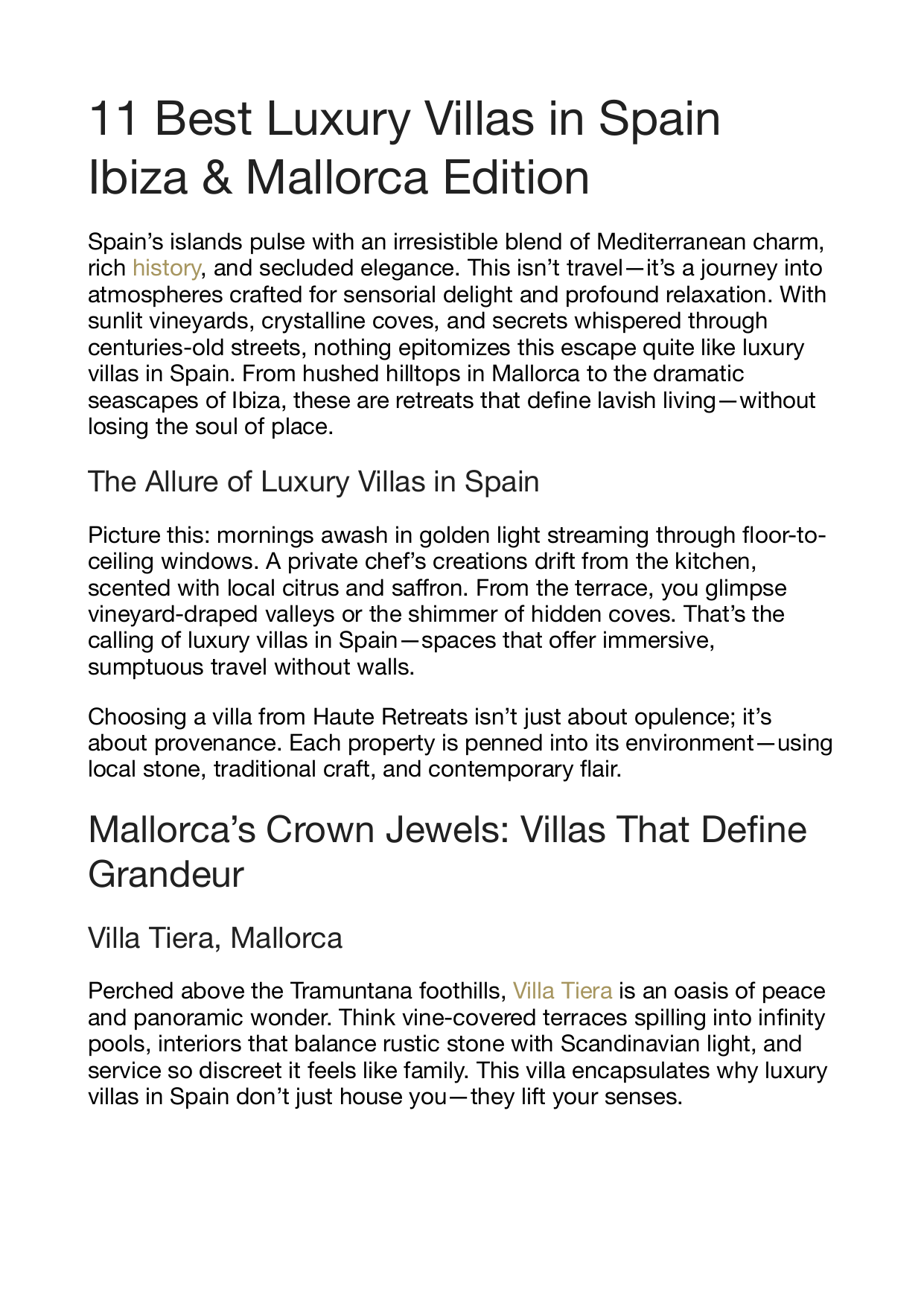 11 Best Luxury Villas in Spain Ibiza & Mallorca Edition Spain’s islands pulse with an irresistible blend of Mediterranean charm, rich history, and secluded elegance. This isn’t travel—it’s a journey into atmospheres crafted for sensorial delight and profound relaxation. With sunlit vineyards, crystalline coves, and secrets whispered through centuries-old streets, nothing epitomizes this escape quite like luxury villas in Spain. From hushed hilltops in Mallorca to the dramatic seascapes of Ibiza, these are retreats that de ne lavish living—without losing the soul of place. The Allure of Luxury Villas in Spain Picture this: mornings awash in golden light streaming through oor-toceiling windows. A private chef’s creations drift from the kitchen, scented with local citrus and sa ron. From the terrace, you glimpse vineyard-draped valleys or the shimmer of hidden coves. That’s the calling of luxury villas in Spain—spaces that o er immersive, sumptuous travel without walls. Choosing a villa from Haute Retreats isn’t just about opulence; it’s about provenance. Each property is penned into its environment—using local stone, traditional craft, and contemporary air. Mallorca’s Crown Jewels: Villas That De ne Grandeur Villa Tiera, Mallorca fi fi fl fl ff fi ff Perched above the Tramuntana foothills, Villa Tiera is an oasis of peace and panoramic wonder. Think vine-covered terraces spilling into in nity pools, interiors that balance rustic stone with Scandinavian light, and service so discreet it feels like family. This villa encapsulates why luxury villas in Spain don’t just house you—they lift your senses. Casa Gorg, Mallorca Hidden in olive groves near Valldemossa, Casa Gorg is a hidden treasure. Its whimsical architecture—arched windows, sun terraces, mahogany cloisters—re ects the island’s artistic soul. With an in nity pool and indoor-outdoor living spaces, it’s the perfect vantage to watch Mallorcan sunsets fade to starlit serenades. Villa El Lirio, Mallorca fi fl Set mid-coast, Villa El Lirio blends fairytale proportions with ultramodern comfort. Garden nooks, a sun-soaked sundeck, and soothing water elements create a sanctuary for mind and body. This is luxury villas in Spain at its most transformative—where the magic of Mallorca becomes your everyday. Ibiza’s Signature Hideaways: Where Elegance Embraces Edge Villa Hose na, Ibiza A sleek fortress above the Mediterranean, Villa Hose na frames endless ocean views across Ses Salines. Minimalist interiors melt into shaded terraces—perfect for twilight cocktails, yoga at dawn, or starlit dinners. In Hose na, luxury villas in Spain are rede ned as spaces in dialogue with the sea. Casa en el Mar, Ibiza fi fi fi fi fi Arguably the most evocative villa name in Ibiza, Casa en el Mar lives up to its promise. Nestled into a coastal crag, it spills across multiple terraces, showers, re pits, and secluded guest pavilions. It’s the island’s most authentic answer to those searching for private villa rentals Ibiza with unrivalled proximity to the waves. Casa Cari, Ibiza fi Tucked into pine-scape and salt air, Casa Cari strikes a balance between boho charm and timeless elegance. Sun-drenched bedrooms open to hidden patios; paths weave through olive trees to sea-view in nity pools. Here, luxury villas in Spain resonate with the island’s soulful heartbeat. Further Gems: Ibiza & Mallorca’s Secret Retreats Luxury a cionados look for excellence beyond the obvious—and Haute Retreats delivers: Villa de Suenos is a monument to modern architecture and outdoor living, with hall-of-mirrors pool air. ▪ Senon uplifts bohemian spirit on Ibiza’s west coast with its terraced levels and near-vertical sea drop views. ▪ Pazu mixes earthy arts-and-crafts charm with spa-ready serenity in rural Mallorca. ▪ Izarra champions minimalist lines against a backdrop of Grecianlike cypress and horizon-blue pools. ▪ Martinet 6 BR o ers sophisticated monolithic architecture and sweeping panoramic views over southern Mallorca. These are more than villas—they’re curated havens. Each speaks to Spain’s diverse beauty—from rocky coves to olive-draped hills, from sandy Ibizan stretch to Mallorcan mountains. fl ff fi ▪ Why Luxury Villas in Spain Matter It’s not just about privacy—it’s about choice. These are places to wake at your own pace, dine under candles, and live large without breaking stride. You choose a villa near expansive vineyards or perched where the Mediterranean meets cli ; the pace, the view, the curation is entirely yours. Luxury villas in Spain also carry deeper authenticity: stonework by local artisans, pottery in recessed niches, terraces dyed by twilight. These are homes with DNA, echoing centuries of Mediterranean story. Beyond Architecture: The Soul of the Experience Staying in a villa from Haute Retreats isn’t simply lodging; it’s a lifestyle. Picture private chefs preparing aioli-dressed seafood, sunrise yoga on terraces scented with rosemary, spontaneous vineyard strolls, or evenings spent as neighbors of cicadas and starbursts. In Spain, meals stretch like conversation. Wine becomes memory. The scent of pine meets the sea breeze. From Mallorca’s vaulted stone nooks to Ibiza’s night-quieting cli s, the ecosystem of luxury villas in Spain includes your senses, spirit, and smile. Ready to Book Your Villa in Spain? Luxury villas in Spain are no longer simply places to stay—they are curated experiences woven into the very fabric of Mediterranean living. Secure your next villa with Haute Retreats and step into a retreat crafted just for you. Explore the full collection of Luxury Villas in Spain Contact our specialists to design your escape, whether your heart beats for the scrubby majesty of Ibiza or the graceful slopes of Mallorca. ff ff Guide to Choosing Your Villa ▪ ▪ ▪ ▪ For vistas that go on forever: Choose Ibiza’s cli top sanctuaries like Villa Hose na or Casa en el Mar. For 