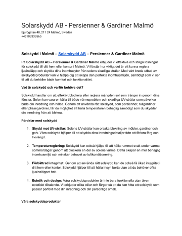 Solarskydd AB - Persienner & Gardiner Malmö Bjurögatan 48, 211 24 Malmö, Sweden +46103333565 Solskydd i Malmö – Solarskydd AB – Persienner & Gardiner Malmö På Solarskydd AB – Persienner & Gardiner Malmö erbjuder vi effektiva och stiliga lösningar för solskydd till ditt hem eller kontor i Malmö. Vi förstår hur viktigt det är att kunna reglera ljusinsläpp och skydda dina inomhusytor från solens skadliga strålar. Med vårt breda utbud av solskyddsprodukter kan vi hjälpa dig att skapa den perfekta inomhusmiljön, samtidigt som vi ser till att du behåller både komfort och funktionalitet. Vad är solskydd och varför behövs det? Solskydd handlar om att effektivt blockera eller reglera mängden sol som tränger in genom dina fönster. Solen kan vara en källa till både värmeproblem och skadliga UV-strålar som påverkar både din inredning och hälsa. Genom att använda rätt solskydd, som persienner, rullgardiner eller plissegardiner, får du möjlighet att hålla temperaturen behaglig samtidigt som du skyddar din inredning från att blekna. Fördelar med solskydd 1. Skydd mot UV-strålar: Solens UV-strålar kan orsaka blekning av möbler, gardiner och golv. Våra solskydd hjälper till att skydda dina inredningsdetaljer från att förlora färg och livslängd. 2. Temperaturreglering: Solskydd kan också hjälpa till att hålla rummet svalt under varma sommardagar genom att blockera en del av solens värme. Detta skapar en mer behaglig inomhusmiljö och minskar behovet av luftkonditionering. 3. Förbättrad integritet: Genom att använda rätt solskydd kan du också få ökad integritet i ditt hem eller kontor. Solskydd hjälper till att hålla insyn borta utan att du behöver offra ljusinsläppet helt. 4. Estetik och design: Våra solskyddsprodukter är inte bara funktionella utan även estetiskt tilltalande. Vi erbjuder olika stilar och färger så att du kan hitta ett solskydd som passar perfekt med din inredning och din personliga smak. Våra solskyddsprodukter På Solarskydd AB – Persienner & Gardiner Malmö erbjuder vi ett brett sortiment av solskydd som passar alla typer av fönster och behov: ● Rullgardiner: En enkel och effektiv lösning för att reglera ljuset i rummet. Våra rullgardiner finns i olika material och färger för att passa just ditt hem. ● Plissegardiner: Ett elegant alternativ som ger både funktion och design. Plissegardiner är flexibla och kan justeras både uppifrån och ner för att skapa den perfekta belysningen. ● Persienner: Persienner är en klassisk lösning för solskydd och ger bra kontroll över ljusinsläppet. De är även praktiska för att skapa privatliv i rummet. ● Screen-gardiner: En modern lösning för att blockera solens strålar utan att förlora utsikten. Perfekt för stora fönster eller för att skapa ett mer industriellt utseende. Varför välja Solarskydd AB – Persienner & Gardiner Malmö? Vi på Solarskydd AB – Persienner & Gardiner Malmö har lång erfarenhet och expertis inom solskydd och vi är dedikerade till att hjälpa dig hitta den bästa lösningen för ditt hem eller kontor. Vi erbjuder inte bara högkvalitativa produkter, utan vi ser även till att installationen sker professionellt och smidigt. Vårt team finns här för att ge dig rådgivning och hjälpa dig att välja det bästa solskyddet baserat på dina specifika behov och inredning. Vi har ett brett urval av produkter som passar alla typer av fönster och rum. Kontakta oss för mer information Tveka inte att kontakta oss för att boka en kostnadsfri konsultation eller om du har några frågor om våra produkter. Vi hjälper gärna till att hitta den perfekta solskyddslösningen för just ditt hem eller kontor. Adress: Bjurögatan 48, 211 24 Malmö Telefon: +46 10 333 35 65