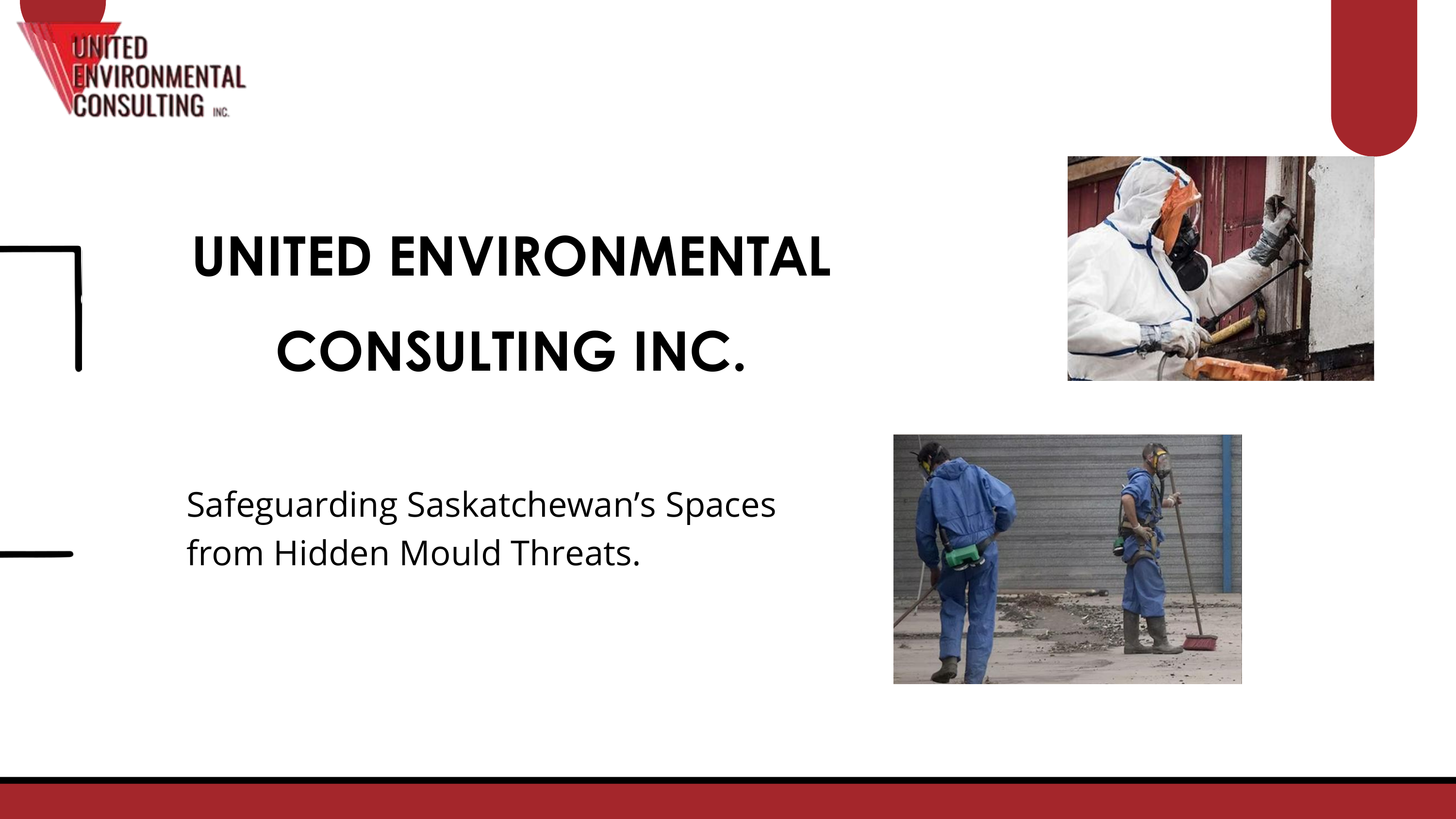 UNITED ENVIRONMENTAL CONSULTING INC. Safeguarding Saskatchewan’s Spaces from Hidden Mould Threats. STOP MOULD BEFORE IT SPREADS Lorem ipsum dolor sit amet, consectetur adipiscing elit. Duis vel dolor ante. Nullam feugiat egestas elit et vehicula. Proin venenatis, orci nec cursus tristique. ADVANCED TESTING FOR CLEAN AIR Accurate testing is key. Using industry-standard tools, United Environmental Consulting Inc. collects samples and analyses results to determine mould levels in homes, schools, and workplaces throughout Saskatoon. LEARN TO MANAGE MOULD THE RIGHT WAY Professionals need proper training to deal with mould safely. United Environmental Consulting Inc. delivers practical mould training across Saskatchewan, covering inspection methods, safety measures, and removal techniques. THANK YOU For more information or to schedule a consultation: https://www.ueconsulting.ca/ [email protected] a 306-250-5828 Saskatoon, SK, Canada · Regina, SK, Canada