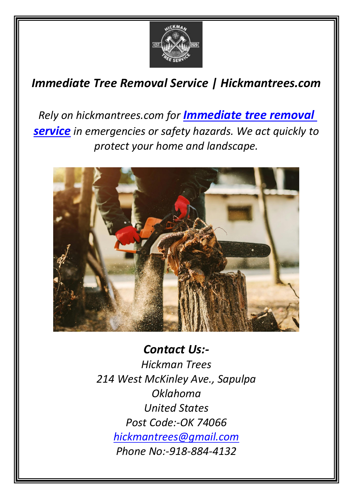 Immediate Tree Removal Service | Hickmantrees.com Rely on hickmantrees.com for Immediate tree removal service in emergencies or safety hazards. We act quickly to protect your home and landscape. Contact Us:- Hickman Trees 214 West McKinley Ave., Sapulpa Oklahoma United States Post Code:-OK 74066 [email protected] Phone No:-918-884-4132