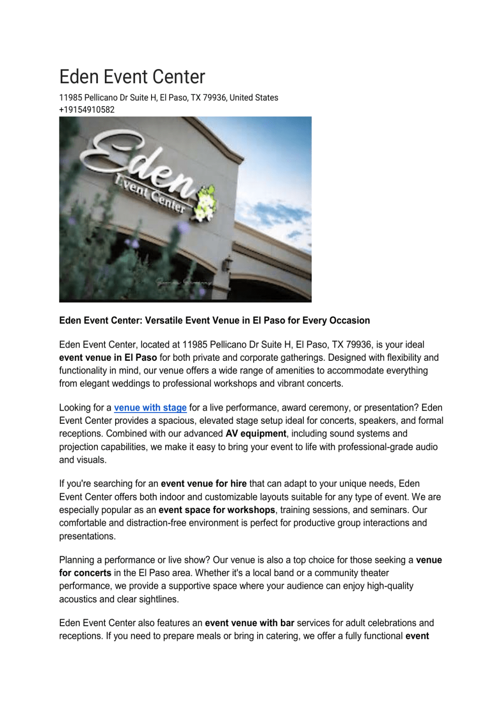 Eden Event Center 11985 Pellicano Dr Suite H, El Paso, TX 79936, United States +19154910582 Eden Event Center: Versatile Event Venue in El Paso for Every Occasion Eden Event Center, located at 11985 Pellicano Dr Suite H, El Paso, TX 79936, is your ideal event venue in El Paso for both private and corporate gatherings. Designed with flexibility and functionality in mind, our venue offers a wide range of amenities to accommodate everything from elegant weddings to professional workshops and vibrant concerts. Looking for a venue with stage for a live performance, award ceremony, or presentation? Eden Event Center provides a spacious, elevated stage setup ideal for concerts, speakers, and formal receptions. Combined with our advanced AV equipment, including sound systems and projection capabilities, we make it easy to bring your event to life with professional-grade audio and visuals. If you're searching for an event venue for hire that can adapt to your unique needs, Eden Event Center offers both indoor and customizable layouts suitable for any type of event. We are especially popular as an event space for workshops, training sessions, and seminars. Our comfortable and distraction-free environment is perfect for productive group interactions and presentations. Planning a performance or live show? Our venue is also a top choice for those seeking a venue for concerts in the El Paso area. Whether it's a local band or a community theater performance, we provide a supportive space where your audience can enjoy high-quality acoustics and clear sightlines. Eden Event Center also features an event venue with bar services for adult celebrations and receptions. If you need to prepare meals or bring in catering, we offer a fully functional event venue with kitchen, making it easy for vendors or event hosts to manage food and beverage logistics smoothly. For couples looking for a beautiful wedding venue in Socorro, Eden Event Center offers easy access and elegant spaces perfect for ceremonies and receptions. Our location also makes us a convenient and professional choice for businesses in search of a corporate event space in Horizon City, ideal for networking events, employee functions, and business meetings. Why Choose Eden Event Center? Eden Event Center offers all-in-one solutions with premium amenities, professional service, and flexible rental packages. From a venue with AV equipment and kitchen access to ample parking and event planning support, we make sure every detail of your event is handled with care. Whether you're hosting a concert, a workshop, or a wedding, we’re committed to delivering a seamless experience from start to finish. Contact Us Make your event exceptional with Eden Event Center. Call us today at +1 915-491-0582 or visit us at 11985 Pellicano Dr Suite H, El Paso, TX 79936. Book your date now and see why we're the preferred choice for venue rental in El Paso, Socorro, and Horizon City.