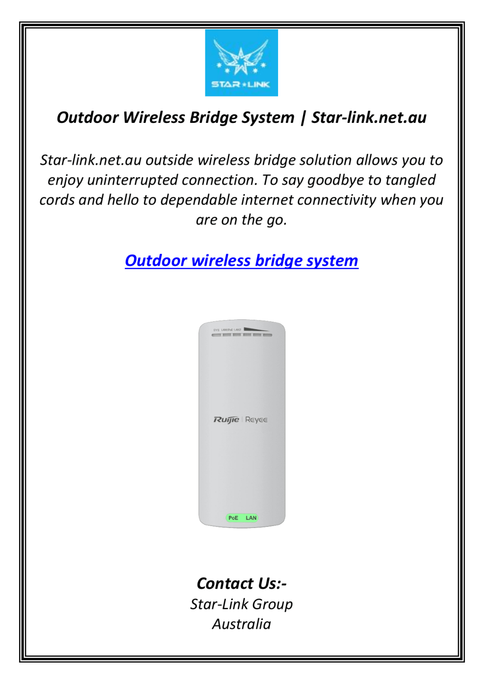 Outdoor Wireless Bridge System | Star-link.net.au Star-link.net.au outside wireless bridge solution allows you to enjoy uninterrupted connection. To say goodbye to tangled cords and hello to dependable internet connectivity when you are on the go. Outdoor wireless bridge system Contact Us:- Star-Link Group Australia