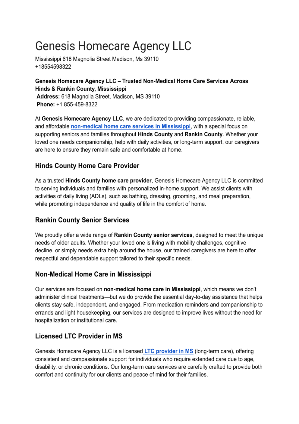 Genesis Homecare Agency LLC Mississippi 618 Magnolia Street Madison, Ms 39110 +18554598322 Genesis Homecare Agency LLC – Trusted Non-Medical Home Care Services Across Hinds & Rankin County, Mississippi Address: 618 Magnolia Street, Madison, MS 39110 Phone: +1 855-459-8322 At Genesis Homecare Agency LLC, we are dedicated to providing compassionate, reliable, and affordable non-medical home care services in Mississippi, with a special focus on supporting seniors and families throughout Hinds County and Rankin County. Whether your loved one needs companionship, help with daily activities, or long-term support, our caregivers are here to ensure they remain safe and comfortable at home. Hinds County Home Care Provider As a trusted Hinds County home care provider, Genesis Homecare Agency LLC is committed to serving individuals and families with personalized in-home support. We assist clients with activities of daily living (ADLs), such as bathing, dressing, grooming, and meal preparation, while promoting independence and quality of life in the comfort of home. Rankin County Senior Services We proudly offer a wide range of Rankin County senior services, designed to meet the unique needs of older adults. Whether your loved one is living with mobility challenges, cognitive decline, or simply needs extra help around the house, our trained caregivers are here to offer respectful and dependable support tailored to their specific needs. Non-Medical Home Care in Mississippi Our services are focused on non-medical home care in Mississippi, which means we don’t administer clinical treatments—but we do provide the essential day-to-day assistance that helps clients stay safe, independent, and engaged. From medication reminders and companionship to errands and light housekeeping, our services are designed to improve lives without the need for hospitalization or institutional care. Licensed LTC Provider in MS Genesis Homecare Agency LLC is a licensed LTC provider in MS (long-term care), offering consistent and compassionate support for individuals who require extended care due to age, disability, or chronic conditions. Our long-term care services are carefully crafted to provide both comfort and continuity for our clients and peace of mind for their families. Why Choose Genesis Homecare Agency LLC? ● Locally Owned and Operated in Madison, proudly serving Hinds and Rankin Counties ● Experienced and Compassionate Caregivers committed to senior dignity and safety ● Flexible Care Plans tailored to each client’s needs and routines ● Affordable, Non-Medical Solutions without sacrificing quality ● Long-Term and Short-Term Options available to fit any homecare need Contact Us Today If you're looking for a dependable partner to help care for your loved ones at home, Genesis Homecare Agency LLC is here for you. 📍 618 Magnolia Street, Madison, MS 39110 📞 +1 855-459-8322