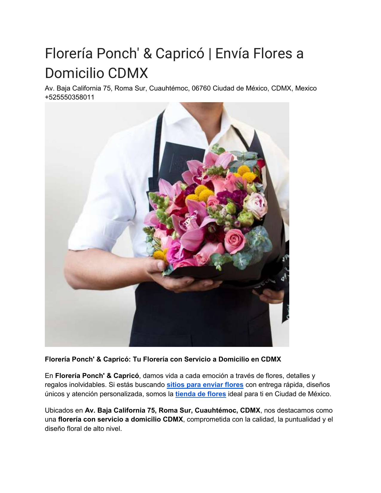 Florería Ponch' & Capricó | Envía Flores a Domicilio CDMX Av. Baja California 75, Roma Sur, Cuauhtémoc, 06760 Ciudad de México, CDMX, Mexico +525550358011 Florería Ponch' & Capricó: Tu Florería con Servicio a Domicilio en CDMX En Florería Ponch' & Capricó, damos vida a cada emoción a través de flores, detalles y regalos inolvidables. Si estás buscando sitios para enviar flores con entrega rápida, diseños únicos y atención personalizada, somos la tienda de flores ideal para ti en Ciudad de México. Ubicados en Av. Baja California 75, Roma Sur, Cuauhtémoc, CDMX, nos destacamos como una florería con servicio a domicilio CDMX, comprometida con la calidad, la puntualidad y el diseño floral de alto nivel. Servicio de Flores con Entrega a Domicilio Nuestro servicio flores es perfecto para quienes desean expresar amor, gratitud o alegría sin salir de casa. Ofrecemos un catálogo exclusivo de ramos y arreglos para toda ocasión. Desde aniversarios hasta cumpleaños o simplemente un "te pienso", contamos con las flores perfectas para cada sentimiento. Ramos de Flores Amarillas: Luz y Alegría en un Detalle Uno de nuestros diseños más populares es el ramo de flores amarillas, ideal para regalar felicidad, amistad y energía positiva. Las flores amarillas son símbolo de luz y esperanza, y en nuestra tienda puedes encontrar opciones modernas y elegantes listas para envío inmediato. Envío de Regalos CDMX: Más que Flores Además de flores, ofrecemos envío de regalos CDMX que incluyen globos, peluches, chocolates y más. Todos nuestros detalles están diseñados para crear momentos memorables, con la opción de personalizar tu entrega para cualquier celebración o sorpresa. Una de las Mejores Florerías CDMX Gracias a nuestro compromiso con la excelencia, atención cálida y productos frescos, Florería Ponch' & Capricó es considerada entre las mejores florerías CDMX. Nos recomiendan quienes buscan buen gusto, calidad y servicio confiable para sorprender a quienes más aman. ¿Por Qué Elegirnos? ● Servicio a domicilio rápido y seguro ● Diseño floral único y personalizado ● Flores frescas seleccionadas cada día ● Atención al cliente cercana y profesional ● Ubicación céntrica y accesible en Roma Sur Contáctanos Hoy Haz tu pedido al +52 55 5035 8011 o visítanos en Av. Baja California 75, Roma Sur, Cuauhtémoc, 06760 Ciudad de México. Si buscas sitios para enviar flores, una florería con servicio a domicilio CDMX o quieres sorprender con un ramo de flores amarillas, en Florería Ponch' & Capricó tenemos lo que necesitas. Celebra, sorprende y emociona. Hazlo con el corazón. Hazlo con Florería Ponch' & Capricó.