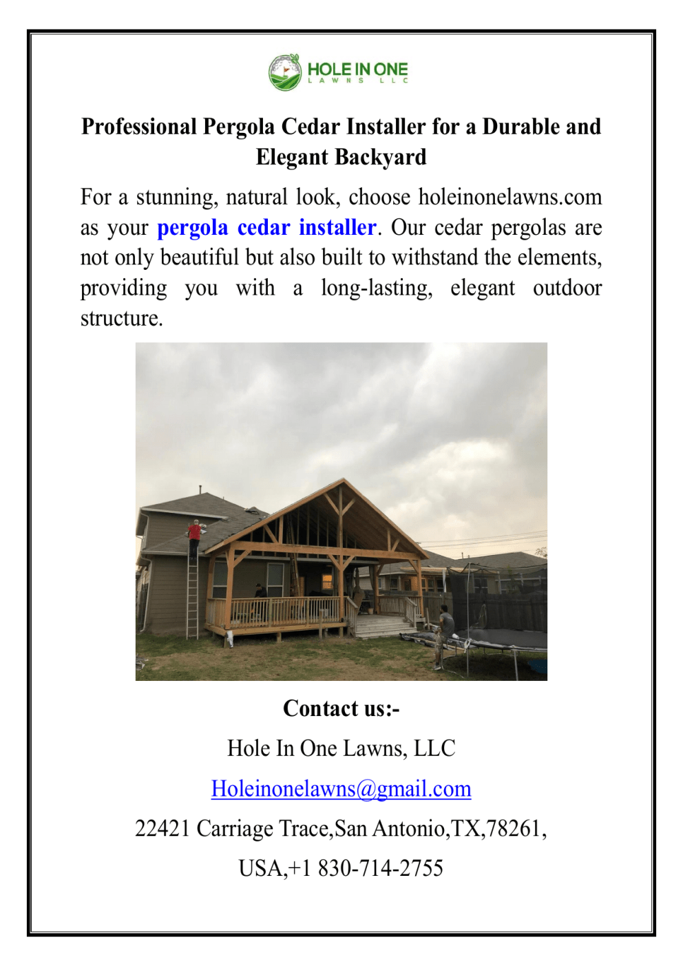 Professional Pergola Cedar Installer for a Durable and Elegant Backyard For a stunning, natural look, choose holeinonelawns.com as your pergola cedar installer. Our cedar pergolas are not only beautiful but also built to withstand the elements, providing you with a long-lasting, elegant outdoor structure. Contact us:Hole In One Lawns, LLC [email protected] 22421 Carriage Trace,San Antonio,TX,78261, USA,+1 830-714-2755