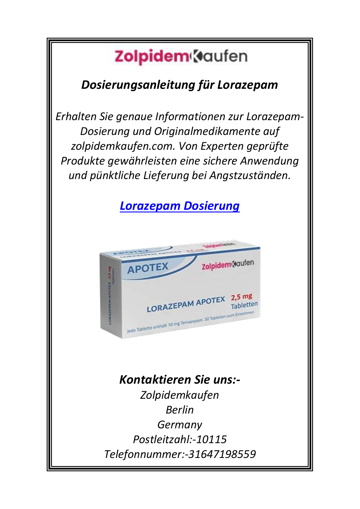 Dosierungsanleitung für Lorazepam Erhalten Sie genaue Informationen zur LorazepamDosierung und Originalmedikamente auf zolpidemkaufen.com. Von Experten geprüfte Produkte gewährleisten eine sichere Anwendung und pünktliche Lieferung bei Angstzuständen. Lorazepam Dosierung Kontaktieren Sie uns:- Zolpidemkaufen Berlin Germany Postleitzahl:-10115 Telefonnummer:-31647198559