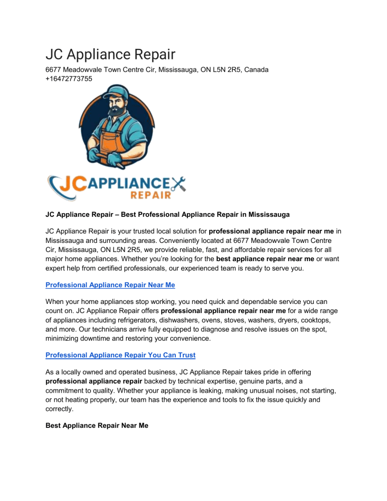 JC Appliance Repair 6677 Meadowvale Town Centre Cir, Mississauga, ON L5N 2R5, Canada +16472773755 JC Appliance Repair – Best Professional Appliance Repair in Mississauga JC Appliance Repair is your trusted local solution for professional appliance repair near me in Mississauga and surrounding areas. Conveniently located at 6677 Meadowvale Town Centre Cir, Mississauga, ON L5N 2R5, we provide reliable, fast, and affordable repair services for all major home appliances. Whether you’re looking for the best appliance repair near me or want expert help from certified professionals, our experienced team is ready to serve you. Professional Appliance Repair Near Me When your home appliances stop working, you need quick and dependable service you can count on. JC Appliance Repair offers professional appliance repair near me for a wide range of appliances including refrigerators, dishwashers, ovens, stoves, washers, dryers, cooktops, and more. Our technicians arrive fully equipped to diagnose and resolve issues on the spot, minimizing downtime and restoring your convenience. Professional Appliance Repair You Can Trust As a locally owned and operated business, JC Appliance Repair takes pride in offering professional appliance repair backed by technical expertise, genuine parts, and a commitment to quality. Whether your appliance is leaking, making unusual noises, not starting, or not heating properly, our team has the experience and tools to fix the issue quickly and correctly. Best Appliance Repair Near Me Searching for the best appliance repair near me can be overwhelming with so many options available. At JC Appliance Repair, our reputation is built on trust, efficiency, and satisfied customers. We provide same-day service when possible, work with all major brands, and offer honest pricing with no hidden fees. From small fixes to complex issues, we deliver results that make us the top choice for homeowners in Mississauga. Best Appliance Repair Services for All Major Brands Whether it’s Whirlpool, LG, Samsung, GE, Bosch, KitchenAid, or Maytag, JC Appliance Repair handles them all. Our technicians are trained to provide the best appliance repair service for both older and latest appliance models. We use high-quality replacement parts to ensure longterm reliability and performance. Why Choose JC Appliance Repair Locally Owned and Operated As a Mississauga-based company, we understand local needs and provide fast, accessible service to the community. Skilled Technicians Our team is trained, licensed, and experienced in repairing all major household appliances. Same-Day Appointments We know appliance issues are urgent. That’s why we offer quick response times and efficient scheduling. Transparent and Fair Pricing No hidden charges. We give upfront quotes and only proceed with your approval. Satisfaction Guaranteed Our mission is to restore your appliances and your peace of mind. We stand behind our work with a quality guarantee. Contact Us When you need reliable appliance repairs, count on JC Appliance Repair to deliver professional service every time Address: 6677 Meadowvale Town Centre Cir, Mississauga, ON L5N 2R5, Canada Phone: +16472773755 Call us now to schedule your appointment and experience the best appliance repair in Mississauga. About-us / how-it-works / reviews / service-areas / contact-us