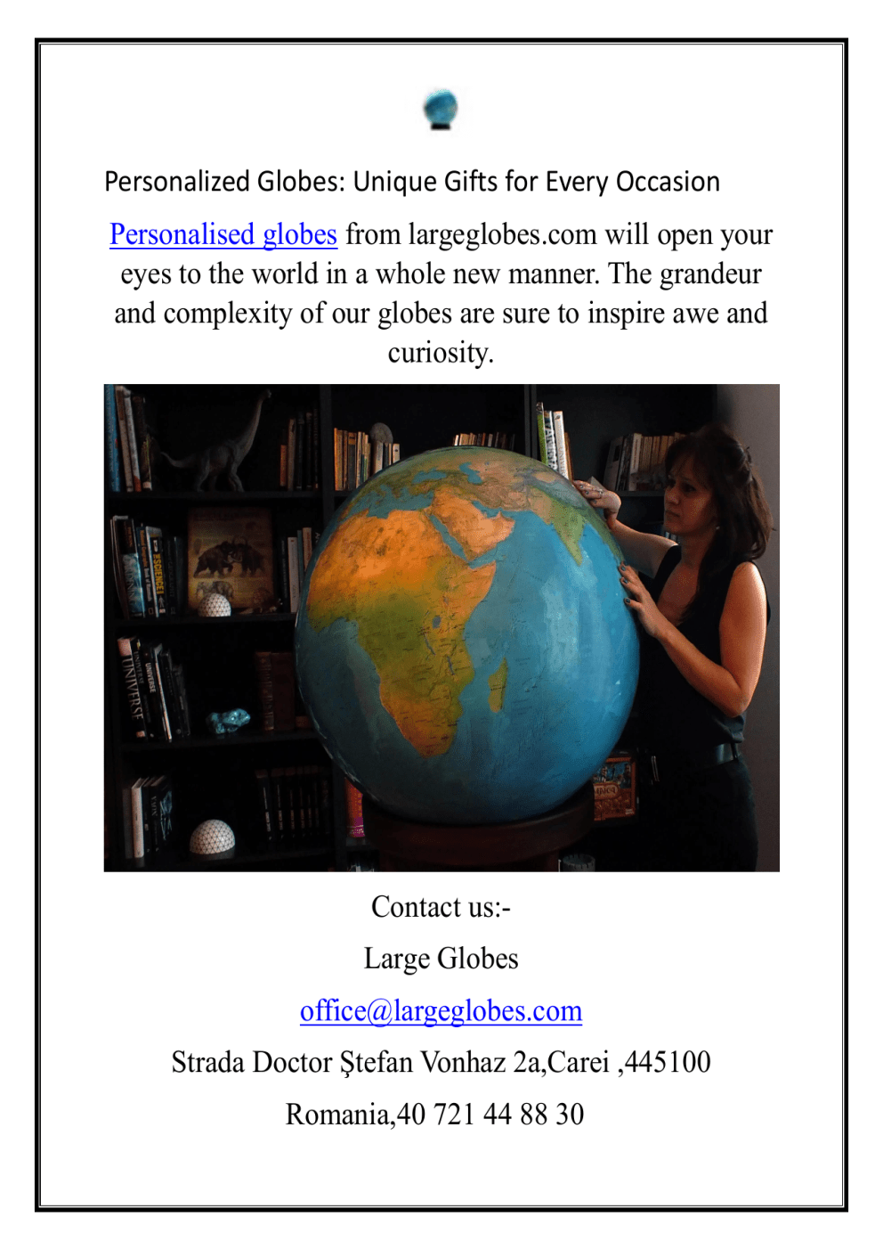 Personalized Globes: Unique Gifts for Every Occasion Personalised globes from largeglobes.com will open your eyes to the world in a whole new manner. The grandeur and complexity of our globes are sure to inspire awe and curiosity. Contact us:Large Globes [email protected] Strada Doctor Ştefan Vonhaz 2a,Carei ,445100 Romania,40 721 44 88 30