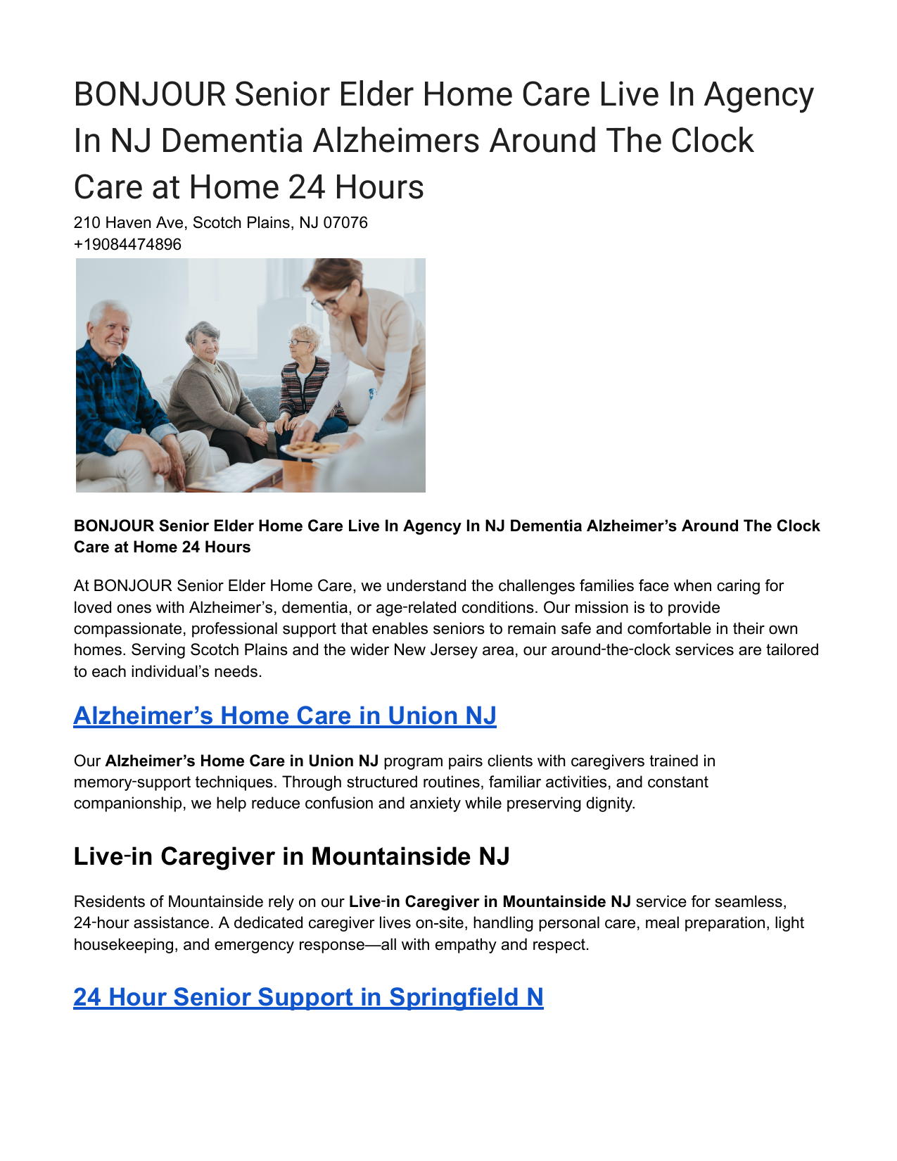 BONJOUR Senior Elder Home Care Live In Agency In NJ Dementia Alzheimers Around The Clock Care at Home 24 Hours 210 Haven Ave, Scotch Plains, NJ 07076 +19084474896 BONJOUR Senior Elder Home Care Live In Agency In NJ Dementia Alzheimer’s Around The Clock Care at Home 24 Hours At BONJOUR Senior Elder Home Care, we understand the challenges families face when caring for loved ones with Alzheimer’s, dementia, or age‑related conditions. Our mission is to provide compassionate, professional support that enables seniors to remain safe and comfortable in their own homes. Serving Scotch Plains and the wider New Jersey area, our around‑the‑clock services are tailored to each individual’s needs. Alzheimer’s Home Care in Union NJ Our Alzheimer’s Home Care in Union NJ program pairs clients with caregivers trained in memory‑support techniques. Through structured routines, familiar activities, and constant companionship, we help reduce confusion and anxiety while preserving dignity. Live‑in Caregiver in Mountainside NJ Residents of Mountainside rely on our Live‑in Caregiver in Mountainside NJ service for seamless, 24‑hour assistance. A dedicated caregiver lives on-site, handling personal care, meal preparation, light housekeeping, and emergency response—all with empathy and respect. 24 Hour Senior Support in Springfield N For families in Springfield, our 24 Hour Senior Support in Springfield NJ ensures round‑the‑clock monitoring and aid. From medication reminders to mobility assistance and overnight supervision, we deliver peace of mind at any hour. Union County NJ 24 Hour Help for Aging Parents Our Union County NJ 24 Hour Help for Aging Parents offering provides flexible scheduling to meet evolving needs. We coordinate with family members and healthcare professionals to update care plans, ensuring your parent receives exactly the support they require. 24 Hour Home Care Morris County NJ In Morris County, our 24 Hour Home Care Morris County NJ service covers all aspects of daily living: personal hygiene, meal planning, transportation to appointments, and companionship. Continuous care prevents isolation and promotes well‑being. Morris County Live‑in Dementia Care Dementia care demands specialized attention. Our Morris County Live‑in Dementia Care caregivers implement calming environments, cognitive stimulation exercises, and behavior‑management strategies that align with each client’s stage of dementia. Live‑in Alzheimer’s Care in Morristown NJ Morristown families trust our Live‑in Alzheimer’s Care in Morristown NJ for around‑the‑clock support tailored to the unique progression of Alzheimer’s. We balance safety measures—such as fall prevention and wandering alarms—with engaging memory therapy. 24 Hour Elder Help in Chatham NJ Our 24 Hour Elder Help in Chatham NJ service offers prompt response to any health change or emergency. Whether your loved one needs midnight assistance, urgent medical alert follow‑up, or just friendly conversation, we’re there. Why Choose BONJOUR Senior Elder Home Care? ● Specialized Alzheimer’s & Dementia Training: Our caregivers undergo rigorous training in memory‑care best practices. ● Live‑in & Hourly Options: Flexible packages from hourly visits to full‑time, live‑in support. ● Holistic Care Plans: Customized to medical needs, personal preferences, and family feedback. ● Local Expertise: Based in Scotch Plains, NJ, we serve Union, Morris, and surrounding counties with rapid response. ● Transparent Pricing: Clear, all‑inclusive rates—no hidden fees or surprise charges. Contact Us Give your loved one the highest quality of home care available: BONJOUR Senior Elder Home Care Live In Agency In NJ Dementia Alzheimer’s Around The Clock Care at Home 24 Hours 210 Haven Ave, Scotch Plains, NJ 07076 Phone: +1 (908) 447‑4896 Call today to schedule a complimentary in‑home assessment and discover how our specialized 24‑hour services can support your family’s unique needs.