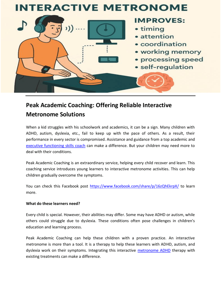 Peak Academic Coaching: Offering Reliable Interactive Metronome Solutions When a kid struggles with his schoolwork and academics, it can be a sign. Many children with ADHD, autism, dyslexia, etc., fail to keep up with the pace of others. As a result, their performance in every sector is compromised. Assistance and guidance from a top academic and executive functioning skills coach can make a difference. But your children may need more to deal with their conditions. Peak Academic Coaching is an extraordinary service, helping every child recover and learn. This coaching service introduces young learners to interactive metronome activities. This can help children gradually overcome the symptoms. You can check this Facebook post https://www.facebook.com/share/p/16zQhEkrpX/ to learn more. What do these learners need? Every child is special. However, their abilities may differ. Some may have ADHD or autism, while others could struggle due to dyslexia. These conditions often pose challenges in children's education and learning process. Peak Academic Coaching can help these children with a proven practice. An interactive metronome is more than a tool. It is a therapy to help these learners with ADHD, autism, and dyslexia work on their symptoms. Integrating this interactive metronome ADHD therapy with existing treatments can make a difference. The Content: As a parent, you must be curious about the content of this therapy. Interactive metronome therapy helps children with ADHD, autism, and similar conditions to get rid of the reasons that cause problems in their learning. For instance, their lack of attention and continuous distraction lead them to these unfavorable results. The interactive metronome from Peak Academic Coaching is a brilliant solution for every learner. This activity-filled therapy lays the foundation for their improvement. Learners can gradually enhance their concentration. They can even fix the problems without struggling. At Home Sessions: Coaches can teach every learner and work on their weaknesses. However, the practice ends once the class or session ends. Children with ADHD, autism, and dyslexia need more attention, especially when it comes to their learning. Peak Academic Coaching brings an interactive metronome at home. This service has solved the matter brilliantly and addressed every concern in the way. The use of this activity at home can help children focus more on their recovery. So, connect with this coaching academy and provide a suitable learning environment for your children. Find out more details at https://peakacademiccoaching.com/ Contact: (800) 710-5242 Original Source: https://bit.ly/4lJHCbR