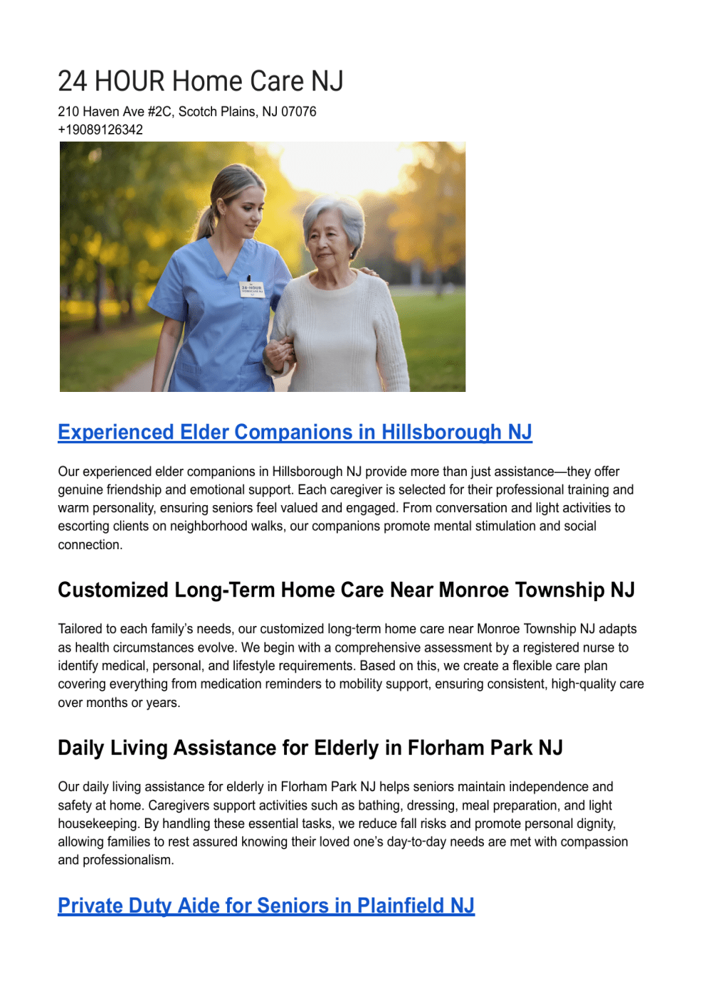24 HOUR Home Care NJ 210 Haven Ave #2C, Scotch Plains, NJ 07076 +19089126342 Experienced Elder Companions in Hillsborough NJ Our experienced elder companions in Hillsborough NJ provide more than just assistance—they offer genuine friendship and emotional support. Each caregiver is selected for their professional training and warm personality, ensuring seniors feel valued and engaged. From conversation and light activities to escorting clients on neighborhood walks, our companions promote mental stimulation and social connection. Customized Long-Term Home Care Near Monroe Township NJ Tailored to each family’s needs, our customized long‑term home care near Monroe Township NJ adapts as health circumstances evolve. We begin with a comprehensive assessment by a registered nurse to identify medical, personal, and lifestyle requirements. Based on this, we create a flexible care plan covering everything from medication reminders to mobility support, ensuring consistent, high‑quality care over months or years. Daily Living Assistance for Elderly in Florham Park NJ Our daily living assistance for elderly in Florham Park NJ helps seniors maintain independence and safety at home. Caregivers support activities such as bathing, dressing, meal preparation, and light housekeeping. By handling these essential tasks, we reduce fall risks and promote personal dignity, allowing families to rest assured knowing their loved one’s day‑to‑day needs are met with compassion and professionalism. Private Duty Aide for Seniors in Plainfield NJ When specialized attention is required, our private duty aides for seniors in Plainfield NJ deliver one‑on‑one support tailored to individual care plans. These aides assist with complex medical tasks—such as post‑surgery monitoring, wound care reminders, and therapy exercises—as well as personal needs. Families benefit from clear communication and detailed care logs, ensuring transparency and confidence in the quality of service. Round-the-Clock Home Care Planning in Bridgewater NJ Our round‑the‑clock home care planning in Bridgewater NJ ensures uninterrupted support for families facing 24‑hour needs. We assign a dedicated care coordinator who designs seamless schedules, arranges caregiver handoffs, and monitors service quality. Whether for overnight supervision, emergency response, or continuous companionship, our planning guarantees that help is always available exactly when it’s needed. Why Choose 24 HOUR Home Care NJ • Personalized care plans crafted by registered nurses and continuously reviewed • Strict caregiver selection with background checks, training, and ongoing evaluation • Flexible scheduling, including same‑day and emergency coverage • Dedicated care coordinator for smooth communication among family and medical teams • Commitment to respect, empathy, and enhancing quality of life for every client Contact Us 24 HOUR Home Care NJ 210 Haven Ave #2C, Scotch Plains, NJ 07076 Phone: +1 908 912 6342 care-services about-us contact-us