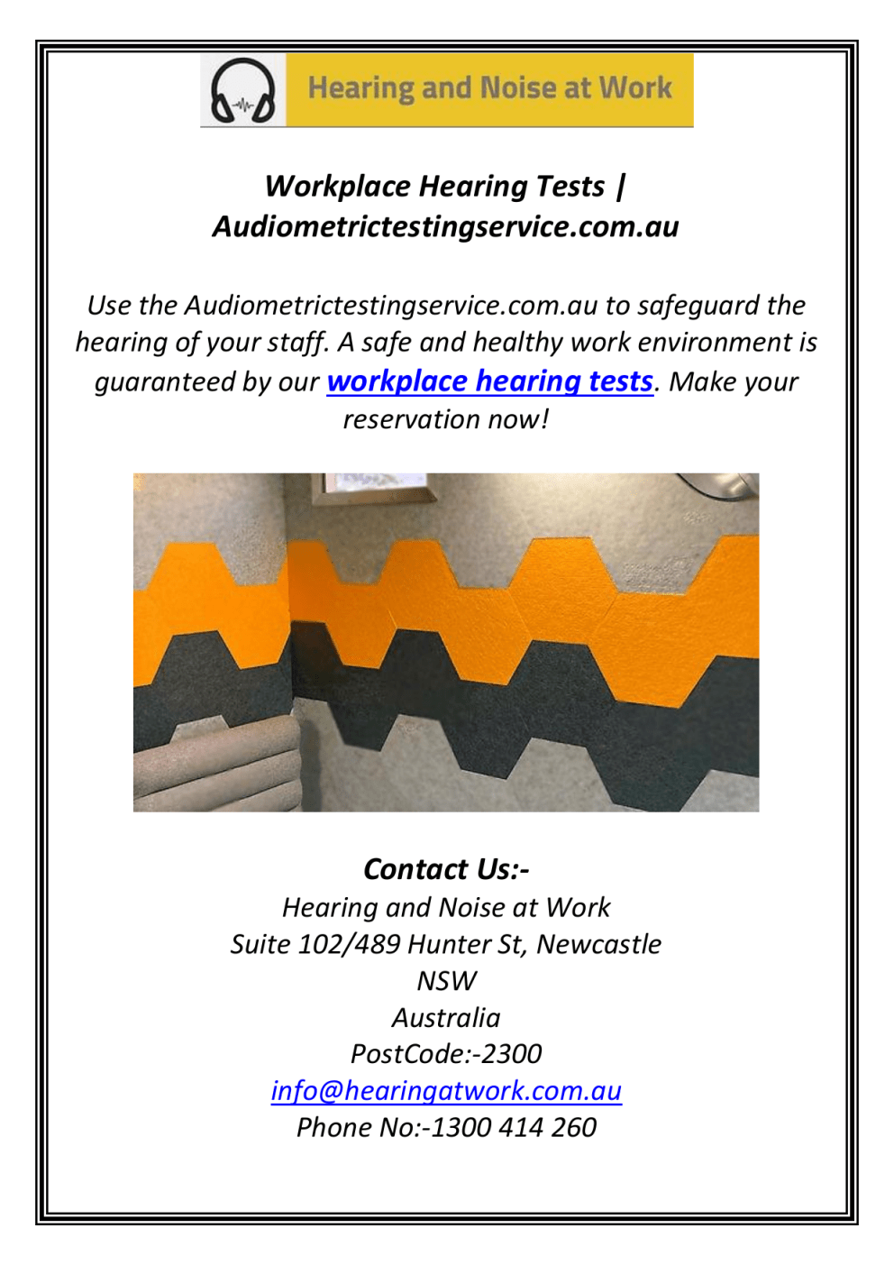 Workplace Hearing Tests | Audiometrictestingservice.com.au Use the Audiometrictestingservice.com.au to safeguard the hearing of your staff. A safe and healthy work environment is guaranteed by our workplace hearing tests. Make your reservation now! Contact Us:- Hearing and Noise at Work Suite 102/489 Hunter St, Newcastle NSW Australia PostCode:-2300 [email protected] Phone No:-1300 414 260