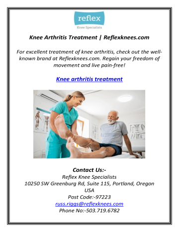 Knee Arthritis Treatment | Reflexknees.com For excellent treatment of knee arthritis, check out the wellknown brand at Reflexknees.com. Regain your freedom of movement and live pain-free! Knee arthritis treatment Contact Us:- Reflex Knee Specialists 10250 SW Greenburg Rd, Suite 115, Portland, Oregon USA Post Code:-97223 [email protected] Phone No:-503.719.6782