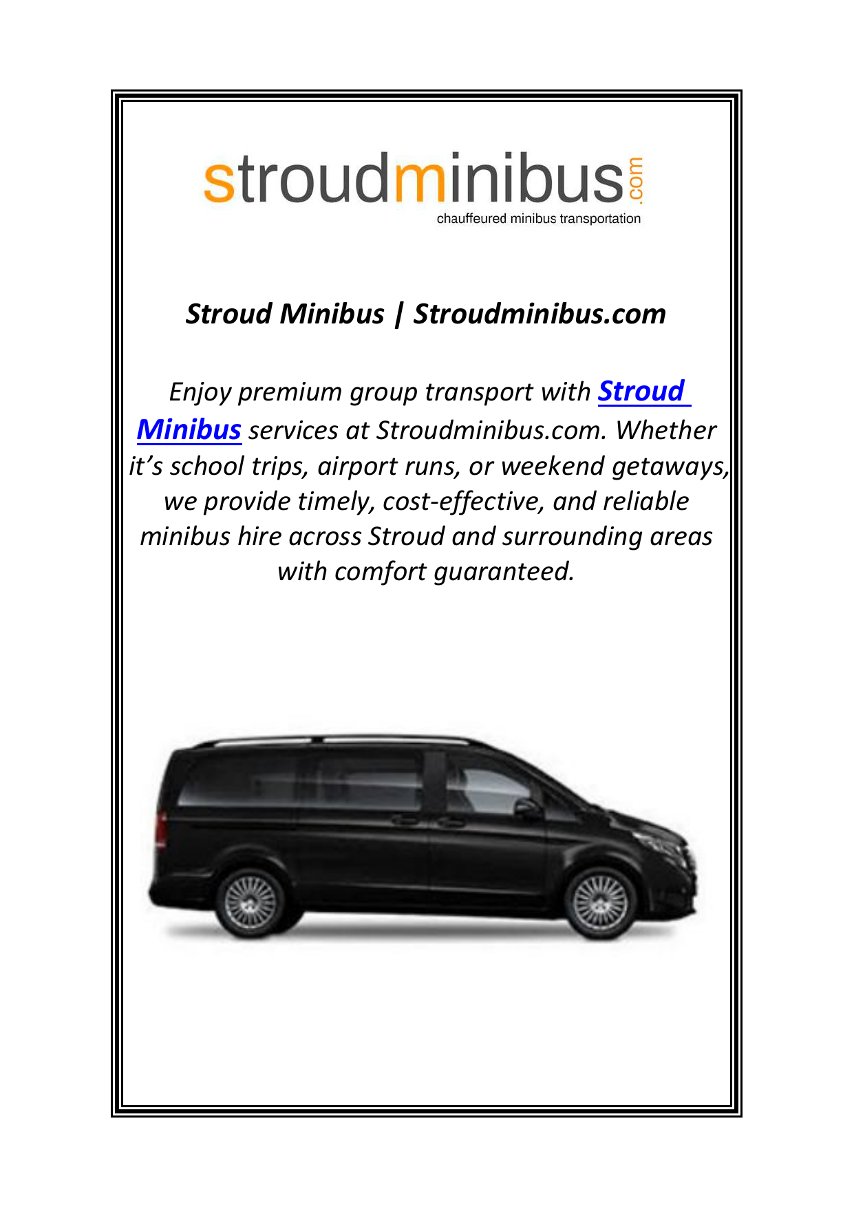 Stroud Minibus | Stroudminibus.com Enjoy premium group transport with Stroud Minibus services at Stroudminibus.com. Whether it’s school trips, airport runs, or weekend getaways, we provide timely, cost-effective, and reliable minibus hire across Stroud and surrounding areas with comfort guaranteed.