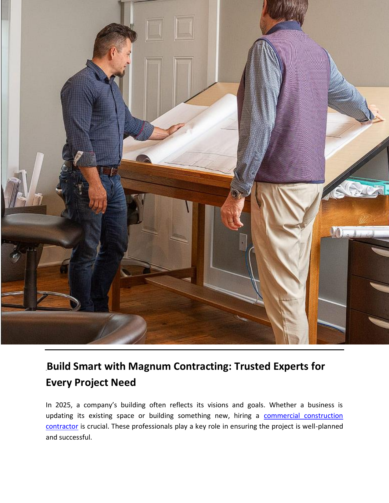 Build Smart with Magnum Contracting: Trusted Experts for Every Project Need In 2025, a company’s building often reflects its visions and goals. Whether a business is updating its existing space or building something new, hiring a commercial construction contractor is crucial. These professionals play a key role in ensuring the project is well-planned and successful. Selecting the right contractor can make a significant difference, enabling businesses to create a space that functions well, looks good, and stays within budget. Hire professionals from reputable construction firms like Magnum Contracting! It offers highly qualified and trained contractors, delivering full-spectrum construction services. Head to this YouTube Video https://youtu.be/8nqe-WOSl_U?si=n_i9fxU7Q5xBQyiLfor more valuable insights. Design Building: Magnum Contracting is a complete general contracting firm! Although it provides the best and most efficient design building solutions. Commercial design build contractors acquire in-depth knowledge in the field and deliver budget-friendly services tailored to your needs. Opt for their services to get the most desirable outcomes. Civil Construction: Do you know civil engineers are vital for planning, designing, and supervising an infrastructure and construction project? Whether you're building a factory, shopping center, or home, hiring a civil engineer ensures your project is safe. They follow the rules and work well with the environment. Choose contractors from reputable firms like Magnum Contracting! It offers highly certified civil engineers that best suit your project. General Contracting: Magnum Contracting is a reputable construction organization that contains an expert team of contractors, engineers, and design builders. They have years of expertise and excel in their particular departments. Hire them for your next construction project to get top-quality and beneficial results. Sanitary Sewer Installation: A properly worked sewer system is very essential for any property. It helps keep homes and the environment clean by safely collecting and getting rid of wastewater. If you struggle with sanitary problems, it's time for a new installation. Choose the services from Magnum Contracting! It offers safe solutions using advanced technologies. The Key Point: If you are confused about choosing the best construction partner, Magnum Contracting has you covered! The Atlanta commercial general contractors have all the certifications and licenses to ensure a smooth and safe work experience. They possess all the essential equipment and stay updated with the latest features and technologies. To get more details, visit https://magnumcontracting.net/ Contact:(770) 421-6300 Original Source: http://bit.ly/44AWKCX