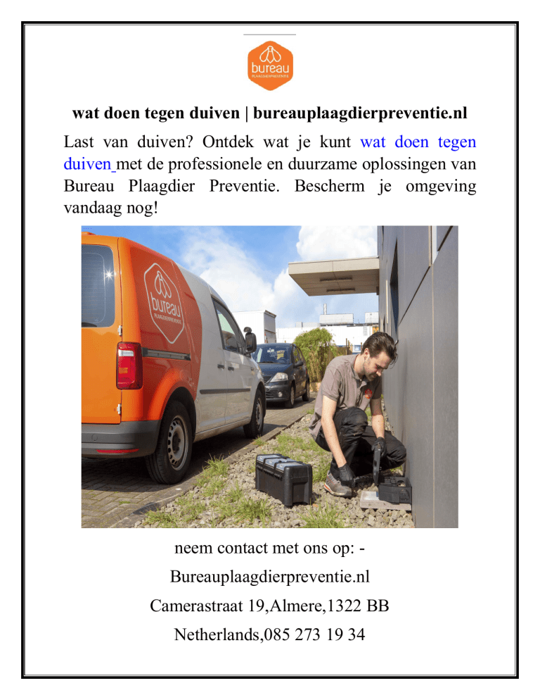 wat doen tegen duiven | bureauplaagdierpreventie.nl Last van duiven? Ontdek wat je kunt wat doen tegen duiven met de professionele en duurzame oplossingen van Bureau Plaagdier Preventie. Bescherm je omgeving vandaag nog! neem contact met ons op: Bureauplaagdierpreventie.nl Camerastraat 19,Almere,1322 BB Netherlands,085 273 19 34