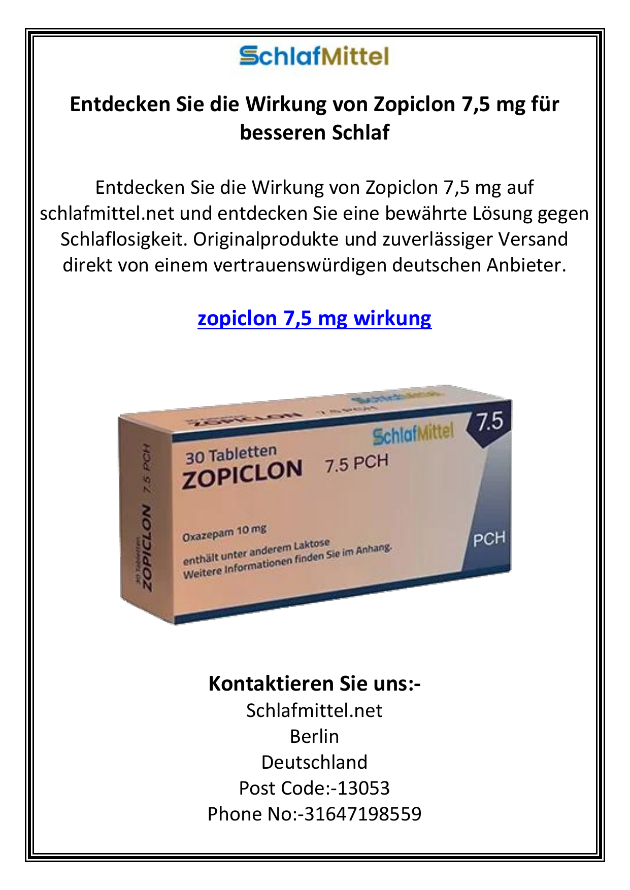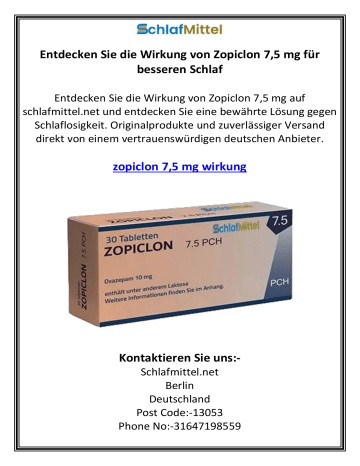 Entdecken Sie die Wirkung von Zopiclon 7,5 mg für besseren Schlaf Entdecken Sie die Wirkung von Zopiclon 7,5 mg auf schlafmittel.net und entdecken Sie eine bewährte Lösung gegen Schlaflosigkeit. Originalprodukte und zuverlässiger Versand direkt von einem vertrauenswürdigen deutschen Anbieter. zopiclon 7,5 mg wirkung Kontaktieren Sie uns:- Schlafmittel.net Berlin Deutschland Post Code:-13053 Phone No:-31647198559
