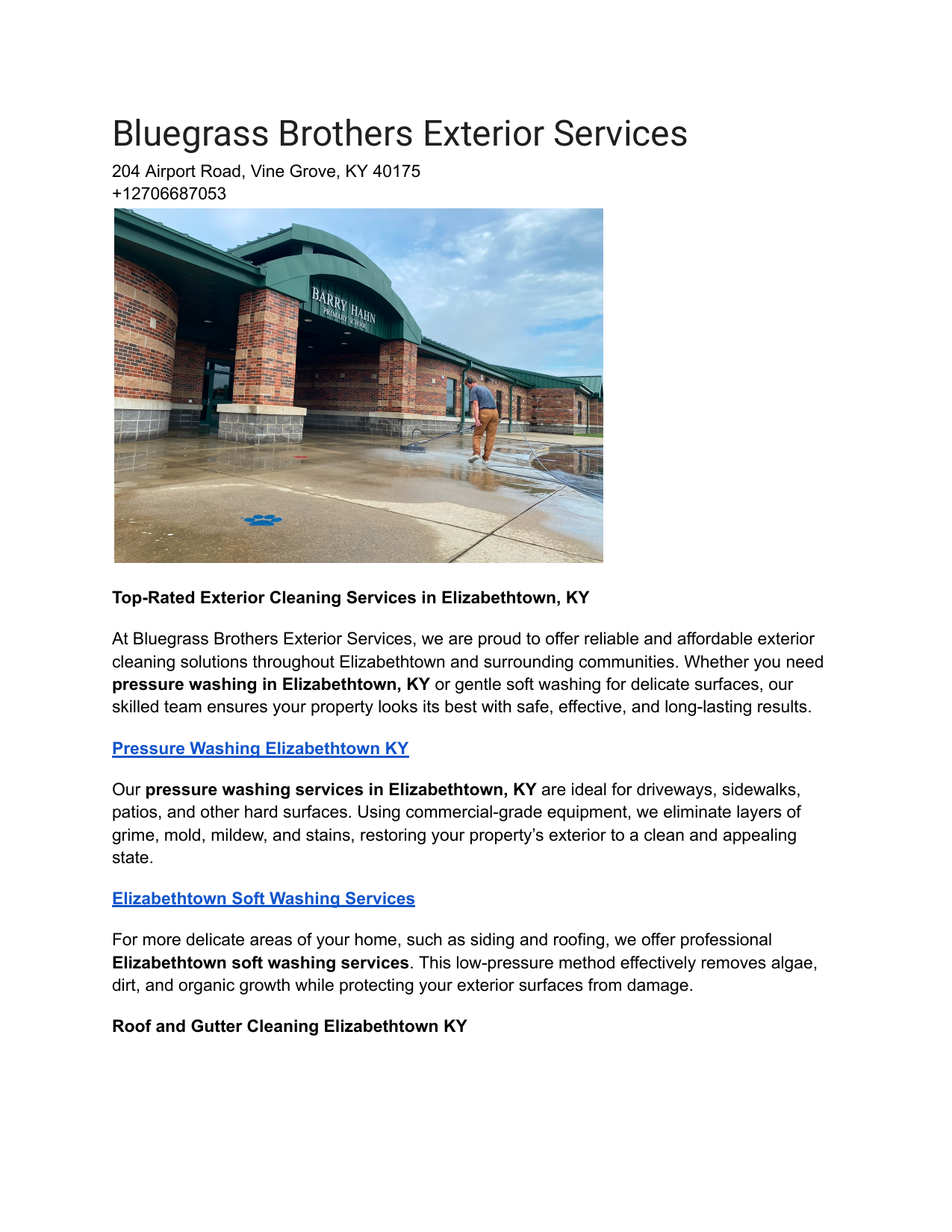Bluegrass Brothers Exterior Services 204 Airport Road, Vine Grove, KY 40175 +12706687053 Top-Rated Exterior Cleaning Services in Elizabethtown, KY At Bluegrass Brothers Exterior Services, we are proud to offer reliable and affordable exterior cleaning solutions throughout Elizabethtown and surrounding communities. Whether you need pressure washing in Elizabethtown, KY or gentle soft washing for delicate surfaces, our skilled team ensures your property looks its best with safe, effective, and long-lasting results. Pressure Washing Elizabethtown KY Our pressure washing services in Elizabethtown, KY are ideal for driveways, sidewalks, patios, and other hard surfaces. Using commercial-grade equipment, we eliminate layers of grime, mold, mildew, and stains, restoring your property’s exterior to a clean and appealing state. Elizabethtown Soft Washing Services For more delicate areas of your home, such as siding and roofing, we offer professional Elizabethtown soft washing services. This low-pressure method effectively removes algae, dirt, and organic growth while protecting your exterior surfaces from damage. Roof and Gutter Cleaning Elizabethtown KY Maintain your home’s value and curb appeal with our specialized roof and gutter cleaning in Elizabethtown, KY. We safely clean roof shingles and clear out debris from your gutters, improving both function and appearance while preventing costly water damage. Concrete Power Washing Elizabethtown Our concrete power washing in Elizabethtown targets oil stains, rust, dirt, and grime on driveways, walkways, and garage floors. We restore your concrete surfaces with powerful yet controlled pressure cleaning that leaves a bright and refreshed finish. Siding Cleaning Company Elizabethtown As a leading siding cleaning company in Elizabethtown, we specialize in removing buildup from vinyl, aluminum, and wood siding. Our cleaning process revives the look of your home’s exterior and helps extend the life of your siding by eliminating harmful contaminants. Why Choose Bluegrass Brothers Exterior Services We are a locally owned and operated business with a reputation for quality, professionalism, and customer satisfaction. Our team uses the safest and most effective methods tailored to each surface we clean. We are fully insured and committed to delivering results that exceed expectations on every job, big or small. Contact Us Need expert exterior cleaning in Elizabethtown, KY? Reach out to Bluegrass Brothers Exterior Services today to schedule your service and get your property looking its best. Business Address: 204 Airport Road, Vine Grove, KY 40175 Phone Number: +1 270-668-7053 Your local partner for dependable pressure washing and soft washing in Elizabethtown and beyond. Services gallery learn