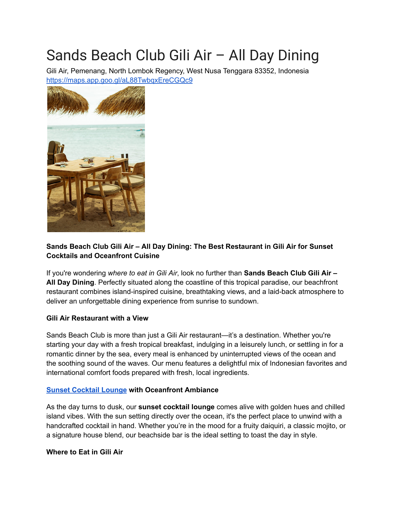 Sands Beach Club Gili Air – All Day Dining Gili Air, Pemenang, North Lombok Regency, West Nusa Tenggara 83352, Indonesia https://maps.app.goo.gl/aL88TwbqxEreCGQc9 Sands Beach Club Gili Air – All Day Dining: The Best Restaurant in Gili Air for Sunset Cocktails and Oceanfront Cuisine If you're wondering where to eat in Gili Air, look no further than Sands Beach Club Gili Air – All Day Dining. Perfectly situated along the coastline of this tropical paradise, our beachfront restaurant combines island-inspired cuisine, breathtaking views, and a laid-back atmosphere to deliver an unforgettable dining experience from sunrise to sundown. Gili Air Restaurant with a View Sands Beach Club is more than just a Gili Air restaurant—it’s a destination. Whether you're starting your day with a fresh tropical breakfast, indulging in a leisurely lunch, or settling in for a romantic dinner by the sea, every meal is enhanced by uninterrupted views of the ocean and the soothing sound of the waves. Our menu features a delightful mix of Indonesian favorites and international comfort foods prepared with fresh, local ingredients. Sunset Cocktail Lounge with Oceanfront Ambiance As the day turns to dusk, our sunset cocktail lounge comes alive with golden hues and chilled island vibes. With the sun setting directly over the ocean, it's the perfect place to unwind with a handcrafted cocktail in hand. Whether you’re in the mood for a fruity daiquiri, a classic mojito, or a signature house blend, our beachside bar is the ideal setting to toast the day in style. Where to Eat in Gili Air If you're searching for where to eat in Gili Air, Sands Beach Club offers the complete experience—delicious food, stunning views, and a welcoming atmosphere. Whether you’re a solo traveler, honeymooning couple, or a group of friends, you’ll find our restaurant to be a relaxing and flavorful escape. From crisp salads and wood-fired pizzas to grilled seafood and vegan delights, there’s something for every taste. Best Restaurant Gili Air for All-Day Dining Recognized by locals and tourists alike, Sands Beach Club is considered one of the best restaurants in Gili Air. With all-day dining, exceptional service, and a menu that caters to every palate, we take pride in offering a consistently outstanding experience. From morning smoothies to sunset cocktails and everything in between, we’re here to make your island time delicious and memorable. Why Choose Sands Beach Club Gili Air ● Stunning beachfront location with panoramic sunset views ● Creative cocktails and premium selections at our sunset lounge ● Diverse all-day menu featuring local and international dishes ● Comfortable seating with relaxed, island-chic décor ● Friendly, attentive service and a laid-back vibe Contact Us Sands Beach Club Gili Air – All Day Dining Gili Air, Pemenang, North Lombok Regency, West Nusa Tenggara 83352, Indonesia Come dine with us and see why we're the best restaurant in Gili Air. From your first bite to your last sip at sunset, we promise a beachfront experience like no other.