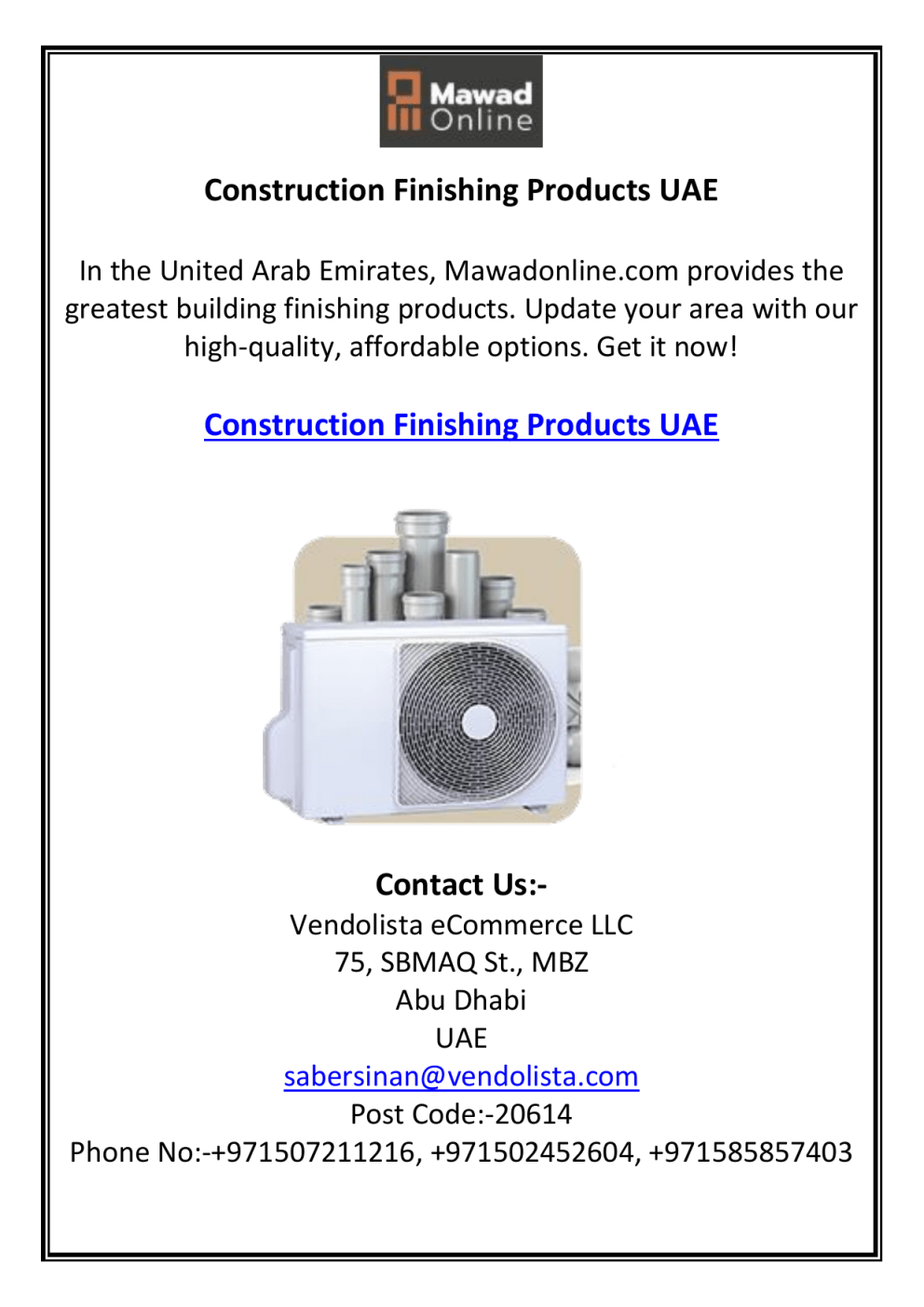 Construction Finishing Products UAE In the United Arab Emirates, Mawadonline.com provides the greatest building finishing products. Update your area with our high-quality, affordable options. Get it now! Construction Finishing Products UAE Contact Us:- Vendolista eCommerce LLC 75, SBMAQ St., MBZ Abu Dhabi UAE [email protected] Post Code:-20614 Phone No:-+971507211216, +971502452604, +971585857403