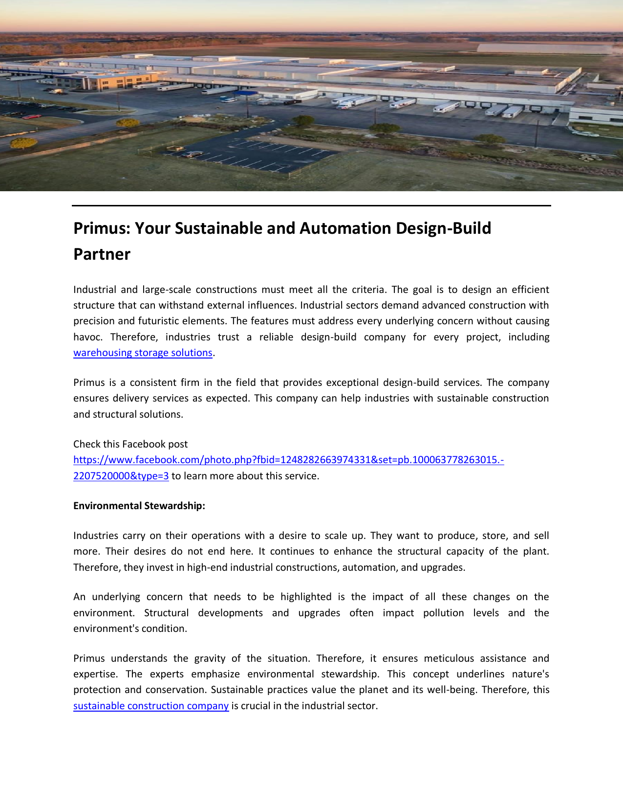 Primus: Your Sustainable and Automation Design-Build Partner Industrial and large-scale constructions must meet all the criteria. The goal is to design an efficient structure that can withstand external influences. Industrial sectors demand advanced construction with precision and futuristic elements. The features must address every underlying concern without causing havoc. Therefore, industries trust a reliable design-build company for every project, including warehousing storage solutions. Primus is a consistent firm in the field that provides exceptional design-build services. The company ensures delivery services as expected. This company can help industries with sustainable construction and structural solutions. Check this Facebook post https://www.facebook.com/photo.php?fbid=1248282663974331&set=pb.100063778263015.2207520000&type=3 to learn more about this service. Environmental Stewardship: Industries carry on their operations with a desire to scale up. They want to produce, store, and sell more. Their desires do not end here. It continues to enhance the structural capacity of the plant. Therefore, they invest in high-end industrial constructions, automation, and upgrades. An underlying concern that needs to be highlighted is the impact of all these changes on the environment. Structural developments and upgrades often impact pollution levels and the environment's condition. Primus understands the gravity of the situation. Therefore, it ensures meticulous assistance and expertise. The experts emphasize environmental stewardship. This concept underlines nature's protection and conservation. Sustainable practices value the planet and its well-being. Therefore, this sustainable construction company is crucial in the industrial sector. Industrial Automation: Adding efficiency to structure and industrial systems can streamline procedures. Industries can operate at better rates and generate more revenue. General automation includes robotic arms, conveyors, cold storage systems, and similar solutions. These solutions can maintain consistency in the workflow and eliminate intricacies. Primus is your partner for life. The team knows how to impress industries and the environment at the same time. Industries can share their workflow and operations with the team. The experts can suggest potential upgrades in the existing procedures by integrating automated systems. These additions can enhance the performance and potential of the plant. The Key Point: Automation is no longer an option for industries. It is a mandatory addition that keeps every business in the competition. Primus ensures the delivery of fine automated storage and retrieval system solutions. The team knows about the primary and advanced industrial requirements. Therefore, it can solve them all without neglecting the sustainability aspect. So, connect with this service now! Get the necessary details about this at https://www.primusbuilders.com/ Original Source: https://bit.ly/46VZM61