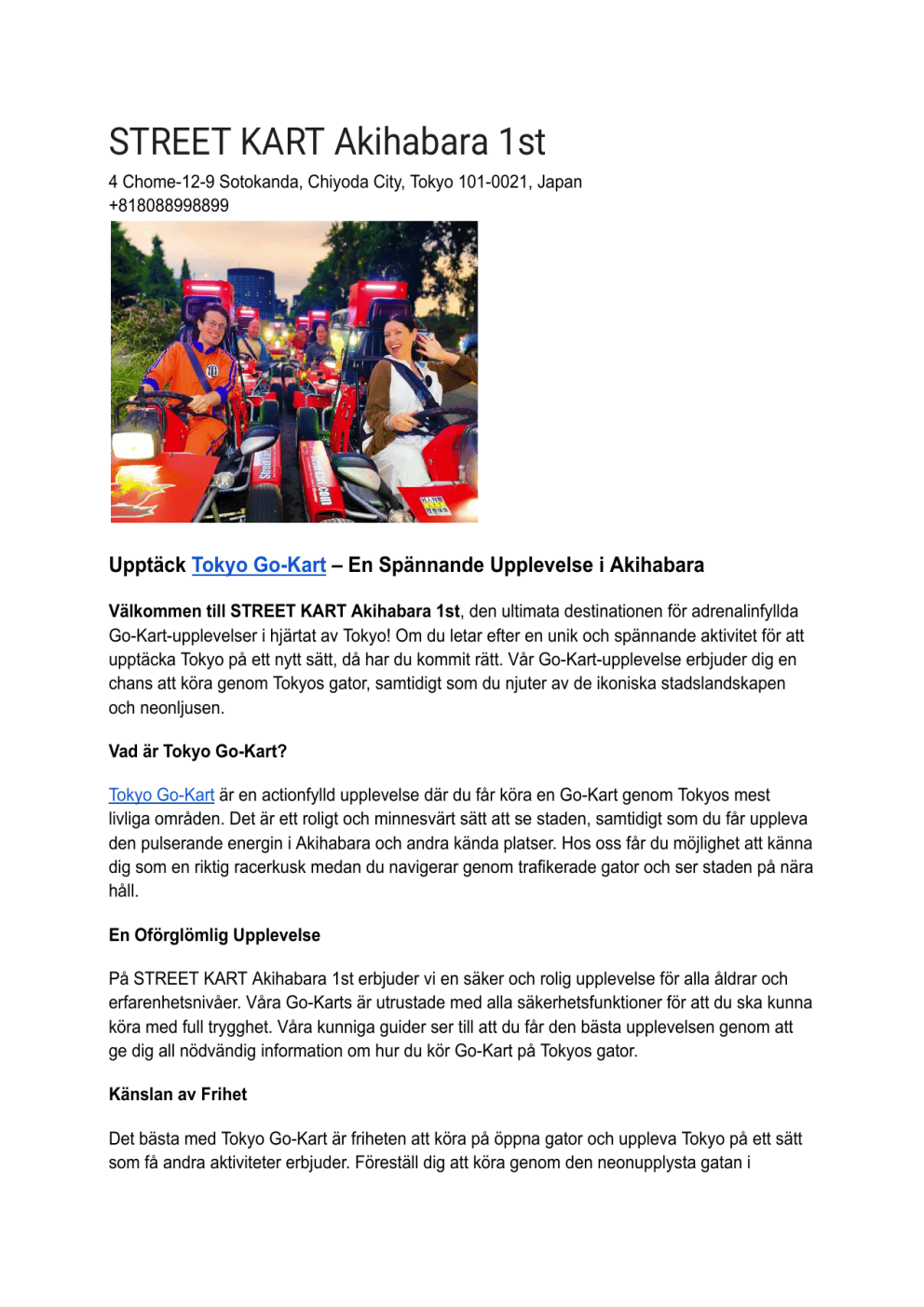 STREET KART Akihabara 1st 4 Chome-12-9 Sotokanda, Chiyoda City, Tokyo 101-0021, Japan +818088998899 Upptäck Tokyo Go-Kart – En Spännande Upplevelse i Akihabara Välkommen till STREET KART Akihabara 1st, den ultimata destinationen för adrenalinfyllda Go-Kart-upplevelser i hjärtat av Tokyo! Om du letar efter en unik och spännande aktivitet för att upptäcka Tokyo på ett nytt sätt, då har du kommit rätt. Vår Go-Kart-upplevelse erbjuder dig en chans att köra genom Tokyos gator, samtidigt som du njuter av de ikoniska stadslandskapen och neonljusen. Vad är Tokyo Go-Kart? Tokyo Go-Kart är en actionfylld upplevelse där du får köra en Go-Kart genom Tokyos mest livliga områden. Det är ett roligt och minnesvärt sätt att se staden, samtidigt som du får uppleva den pulserande energin i Akihabara och andra kända platser. Hos oss får du möjlighet att känna dig som en riktig racerkusk medan du navigerar genom trafikerade gator och ser staden på nära håll. En Oförglömlig Upplevelse På STREET KART Akihabara 1st erbjuder vi en säker och rolig upplevelse för alla åldrar och erfarenhetsnivåer. Våra Go-Karts är utrustade med alla säkerhetsfunktioner för att du ska kunna köra med full trygghet. Våra kunniga guider ser till att du får den bästa upplevelsen genom att ge dig all nödvändig information om hur du kör Go-Kart på Tokyos gator. Känslan av Frihet Det bästa med Tokyo Go-Kart är friheten att köra på öppna gator och uppleva Tokyo på ett sätt som få andra aktiviteter erbjuder. Föreställ dig att köra genom den neonupplysta gatan i Akihabara, förbi de högteknologiska byggnaderna och kända landmärken som gör Tokyo så speciellt. Vad Du Behöver För att delta i vår Tokyo Go-Kart-upplevelse behöver du bara vara minst 18 år gammal och ha ett internationellt körkort. Vi erbjuder även kostymer och tillbehör för att göra upplevelsen ännu mer underhållande. Varför inte klä dig i en karaktärsdräkt och ge dig ut på en mini-förarlivstid i Tokyo? Varför Välja STREET KART Akihabara 1st? 1. Oöverträffad Upplevelse – Vi erbjuder en unik chans att köra Go-Kart på Tokyos gator och upptäcka staden från en helt annan synvinkel. 2. Professionell Säkerhet – Vår personal är alltid redo att hjälpa dig och säkerställa att din upplevelse är både säker och rolig. 3. Idealisk Plats – Beläget i Akihabara, den mest kända elektriska stadsdelen i Tokyo, kan du samtidigt uppleva en av stadens mest vibrerande områden. 4. Tillgängligt För Alla – Oavsett om du är en Go-Kart-nybörjare eller en erfaren förare, kan alla njuta av denna äventyrliga upplevelse. Boka Din Åktur Idag! Är du redo att uppleva Tokyo på ett sätt du aldrig gjort tidigare? Besök oss på STREET KART Akihabara 1st och boka din Go-Kart-upplevelse idag! Vi ser fram emot att ge dig en adrenalinfylld åktur genom Tokyos gator. Adress: 4 Chome-12-9 Sotokanda, Chiyoda City, Tokyo 101-0021, Japan Telefonnummer: +818088998899 akihabara.html#about faq_akihabara.html booking_akihabara.html