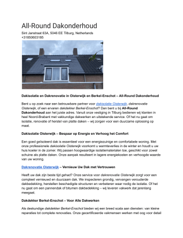 All-Round Dakonderhoud Sint Janstraat 63A, 5046 EE Tilburg, Netherlands +31850603185 Dakisolatie en Dakrenovatie in Oisterwijk en Berkel-Enschot – All-Round Dakonderhoud Bent u op zoek naar een betrouwbare partner voor dakisolatie Oisterwijk, dakrenovatie Oisterwijk, of een ervaren dakdekker Berkel-Enschot? Dan bent u bij All-Round Dakonderhoud aan het juiste adres. Vanuit onze vestiging in Tilburg bedienen wij klanten in heel Noord-Brabant met vakkundige dakwerken en uitstekende service. Of het nu gaat om isolatie, renovatie of herstel van platte daken – wij zorgen voor een duurzame oplossing op maat. Dakisolatie Oisterwijk – Bespaar op Energie en Verhoog het Comfort Een goed geïsoleerd dak is essentieel voor een energiezuinige en comfortabele woning. Met onze professionele dakisolatie Oisterwijk voorkomt u warmteverlies in de winter en houdt u uw huis koeler in de zomer. Wij passen hoogwaardige isolatiematerialen toe, geschikt voor zowel schuine als platte daken. Onze aanpak resulteert in lagere energiekosten en verhoogde waarde van uw woning. Dakrenovatie Oisterwijk – Vernieuw Uw Dak met Vertrouwen Heeft uw dak zijn beste tijd gehad? Onze service voor dakrenovatie Oisterwijk zorgt voor een compleet vernieuwd en duurzaam dak. We inspecteren grondig, vervangen verouderde dakbedekking, herstellen beschadigde structuren en verbeteren waar nodig de isolatie. Of het nu gaat om een pannendak of bitumen dakbedekking – wij leveren vakwerk dat jarenlang meegaat. Dakdekker Berkel-Enschot – Voor Alle Dakwerken Als deskundige dakdekker Berkel-Enschot bieden wij een breed scala aan diensten: van kleine reparaties tot complete renovaties. Onze gecertificeerde vakmensen werken met oog voor detail en veiligheid. Wij staan paraat voor spoedreparaties, periodiek onderhoud en inspecties. Dankzij onze efficiënte werkwijze en transparante communicatie weet u altijd waar u aan toe bent. Plat Dak Renovatie Berkel-Enschot – Duurzaam en Waterdicht Een plat dak renovatie Berkel-Enschot vraagt om een specialistische aanpak. Wij beoordelen de staat van uw dakconstructie en kiezen de juiste materialen voor optimale levensduur en waterdichtheid. Of het nu gaat om EPDM, bitumen of andere dakbedekking – wij zorgen voor een strakke afwerking en perfecte bescherming tegen alle weersinvloeden. Waarom kiezen voor All-Round Dakonderhoud? Meer dan 15 jaar ervaring in dakwerken Snelle service bij spoedklussen en lekkages Gebruik van duurzame materialen en innovatieve technieken Actief in Tilburg, Oisterwijk, Berkel-Enschot en omgeving Persoonlijk advies, duidelijke offertes en eerlijk vakmanschap Contact opnemen Wilt u meer weten over dakisolatie Oisterwijk, dakrenovatie Oisterwijk of zoekt u een dakdekker in Berkel-Enschot? Neem dan contact op met All-Round Dakonderhoud. Adres: Sint Janstraat 63A, 5046 EE Tilburg, Netherlands Telefoonnummer: +31 85 060 3185 Wij staan klaar voor al uw dakbehoeften. Vraag vandaag nog een gratis inspectie of vrijblijvende offerte aan Google-reviews over-ons contact