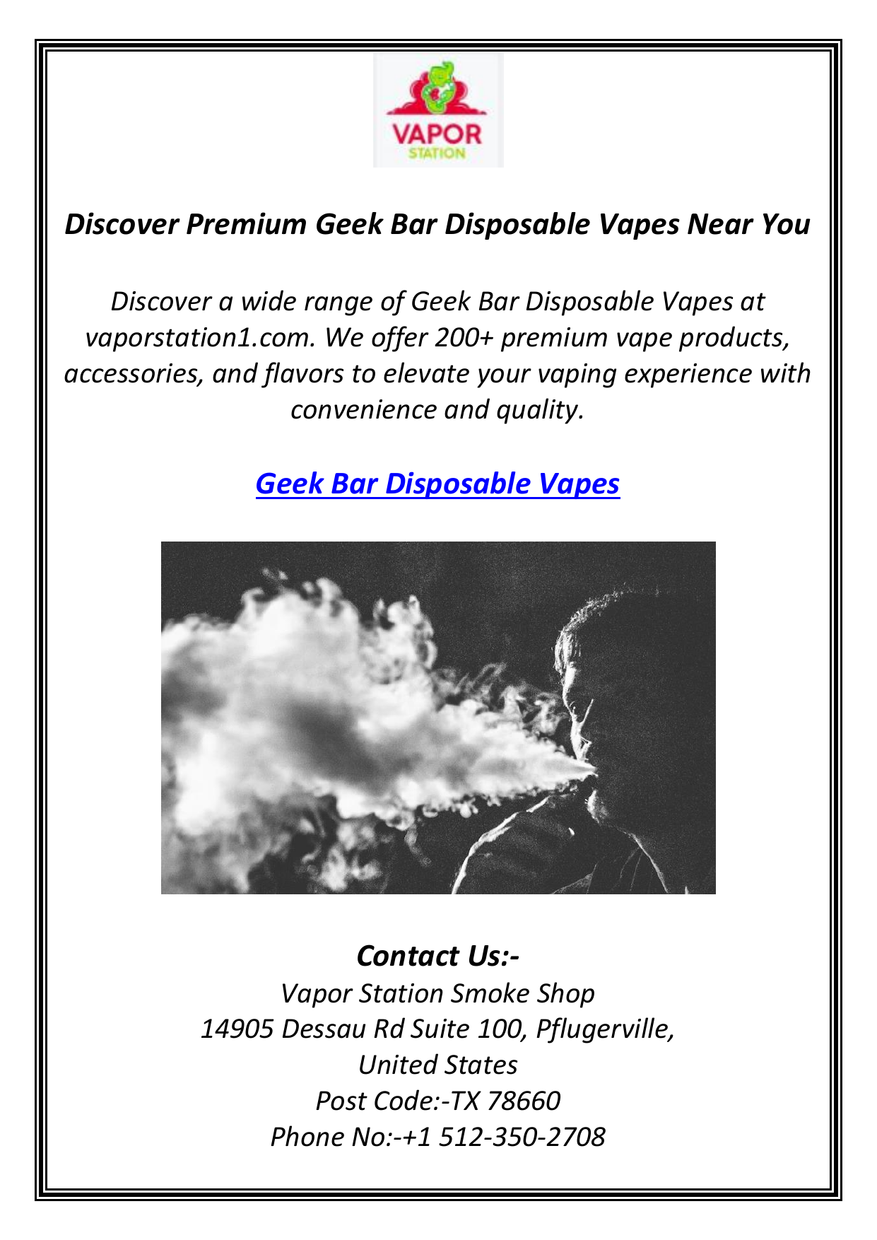 Discover Premium Geek Bar Disposable Vapes Near You Discover a wide range of Geek Bar Disposable Vapes at vaporstation1.com. We offer 200+ premium vape products, accessories, and flavors to elevate your vaping experience with convenience and quality. Geek Bar Disposable Vapes Contact Us:- Vapor Station Smoke Shop 14905 Dessau Rd Suite 100, Pflugerville, United States Post Code:-TX 78660 Phone No:-+1 512-350-2708