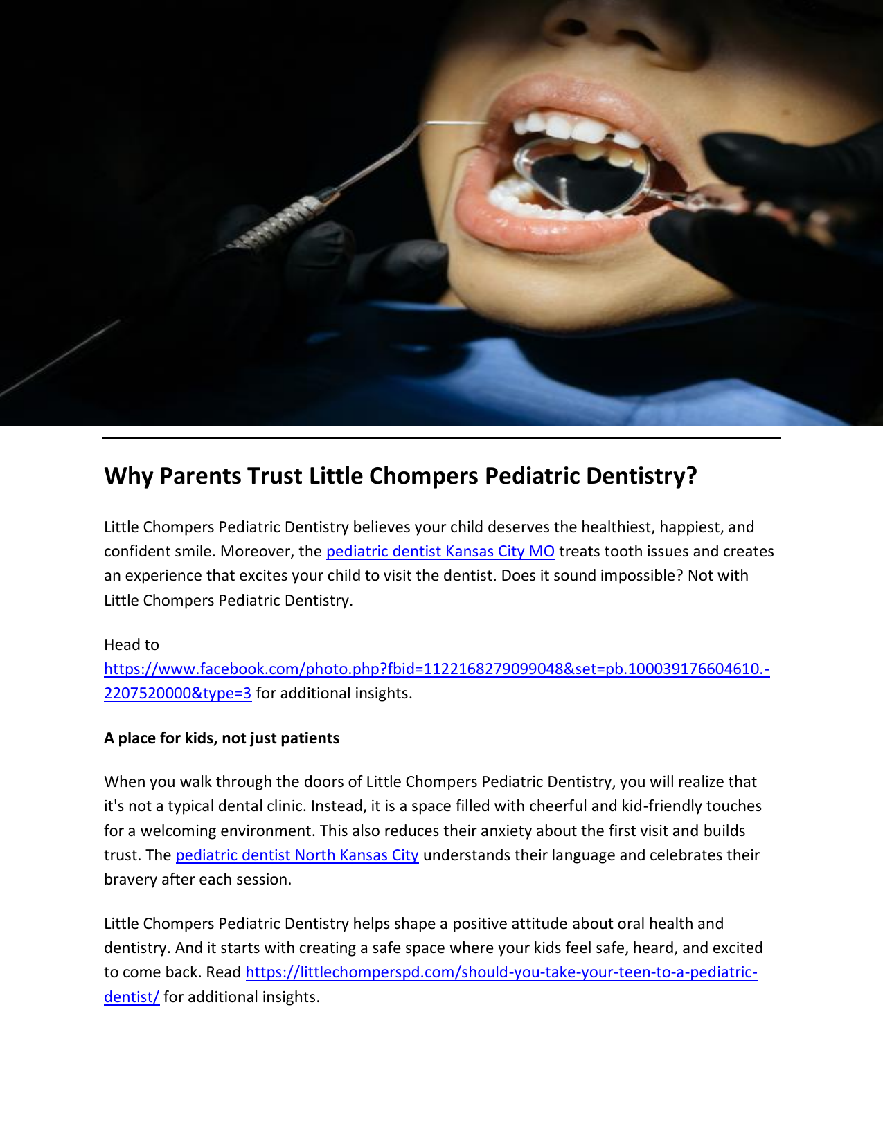 Why Parents Trust Little Chompers Pediatric Dentistry? Little Chompers Pediatric Dentistry believes your child deserves the healthiest, happiest, and confident smile. Moreover, the pediatric dentist Kansas City MO treats tooth issues and creates an experience that excites your child to visit the dentist. Does it sound impossible? Not with Little Chompers Pediatric Dentistry. Head to https://www.facebook.com/photo.php?fbid=1122168279099048&set=pb.100039176604610.2207520000&type=3 for additional insights. A place for kids, not just patients When you walk through the doors of Little Chompers Pediatric Dentistry, you will realize that it's not a typical dental clinic. Instead, it is a space filled with cheerful and kid-friendly touches for a welcoming environment. This also reduces their anxiety about the first visit and builds trust. The pediatric dentist North Kansas City understands their language and celebrates their bravery after each session. Little Chompers Pediatric Dentistry helps shape a positive attitude about oral health and dentistry. And it starts with creating a safe space where your kids feel safe, heard, and excited to come back. Read https://littlechomperspd.com/should-you-take-your-teen-to-a-pediatricdentist/ for additional insights. Pediatric experts understand the kids Little teeth are a big deal. Therefore, the pediatric dentists at Little Chompers Pediatric Dentistry are well-equipped and professionally trained in treating infants, children, teens, and toddlers. From the first checkup itself, they understand the underlying concerns of baby teeth and provide effective solutions. Check this for additional information. But what truly sets Little Chompers Pediatric Dentistry apart is the way it treats your child. The team knows how to ease fears, has an answer to every question asked, and turns a boring routine into a confidence-building adventure. Playful and powerful preventative care Little Chompers Pediatric Dentistry believes in fully utilizing dental visits to catch little problems before they become too big. It offers tooth brushing tutorials and introduces your child to cavity-fighting fluoride in the easiest manner. Want to explore more? Check this. As kids do not sit still, the dentists at Little Chompers Pediatric Dentistry tailor every session with patience and playfulness. Furthermore, the experts use gentle techniques, distraction methods, and little magic tricks to help your child feel in control. Parents love Little Chompers Pediatric Dentistry Choosing a dentist for your growing child is a challenging decision. At Little Chompers Pediatric Dentistry, dentists take your trust seriously, offering clear communication, flexible scheduling, reassurance, and promptly answering the what-if questions. Furthermore, you will notice that the office is high-tech and family-focused, with sedation options and digital X-rays. Little Chompers Pediatric Dentistry, kids dentist Kansas City, is on a mission to make your life easier with a dental health maintenance package. To get more details, visit https://littlechomperspd.com/ Contact: (816) 957-1023 Original Source: https://bit.ly/3GTRKAe