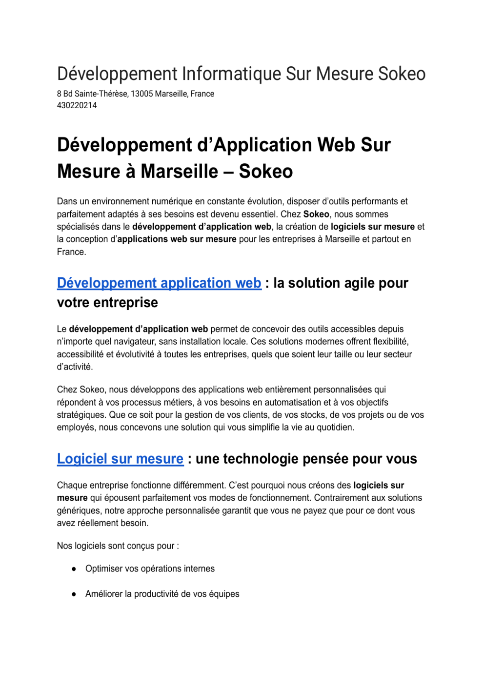 Développement Informatique Sur Mesure Sokeo 8 Bd Sainte-Thérèse, 13005 Marseille, France 430220214 Développement d’Application Web Sur Mesure à Marseille – Sokeo Dans un environnement numérique en constante évolution, disposer d’outils performants et parfaitement adaptés à ses besoins est devenu essentiel. Chez Sokeo, nous sommes spécialisés dans le développement d’application web, la création de logiciels sur mesure et la conception d’applications web sur mesure pour les entreprises à Marseille et partout en France. Développement application web : la solution agile pour votre entreprise Le développement d’application web permet de concevoir des outils accessibles depuis n’importe quel navigateur, sans installation locale. Ces solutions modernes offrent flexibilité, accessibilité et évolutivité à toutes les entreprises, quels que soient leur taille ou leur secteur d’activité. Chez Sokeo, nous développons des applications web entièrement personnalisées qui répondent à vos processus métiers, à vos besoins en automatisation et à vos objectifs stratégiques. Que ce soit pour la gestion de vos clients, de vos stocks, de vos projets ou de vos employés, nous concevons une solution qui vous simplifie la vie au quotidien. Logiciel sur mesure : une technologie pensée pour vous Chaque entreprise fonctionne différemment. C’est pourquoi nous créons des logiciels sur mesure qui épousent parfaitement vos modes de fonctionnement. Contrairement aux solutions génériques, notre approche personnalisée garantit que vous ne payez que pour ce dont vous avez réellement besoin. Nos logiciels sont conçus pour : ● Optimiser vos opérations internes ● Améliorer la productivité de vos équipes ● Réduire les erreurs humaines grâce à l’automatisation ● S’intégrer avec vos outils existants (ERP, CRM, etc.) Nous utilisons des technologies modernes, sécurisées et évolutives pour garantir la longévité et la robustesse de chaque application développée. Application web sur mesure : des outils accessibles et performants L’application web sur mesure combine les avantages du logiciel personnalisé et de l’accessibilité web. Hébergée sur le cloud ou en local selon vos préférences, elle vous permet de gérer votre activité en temps réel, où que vous soyez. Nos applications web sur mesure sont : ● Faciles d’utilisation et intuitives ● Responsives (compatibles mobiles et tablettes) ● Sécurisées avec gestion des accès ● Evolutives pour accompagner la croissance de votre entreprise Pourquoi choisir Développement Informatique Sur Mesure Sokeo ● Expertise locale à Marseille avec une équipe réactive et expérimentée ● Solutions 100 % sur mesure, conçues autour de vos besoins réels ● Méthodologie agile pour une meilleure adaptabilité et visibilité sur le projet ● Support et maintenance inclus, pour une tranquillité d’esprit à long terme ● Transparence totale, de la planification jusqu’à la mise en production Contactez-nous Vous cherchez un partenaire de confiance pour créer votre application web sur mesure ou un logiciel personnalisé ? Faites appel à Sokeo, votre spécialiste du développement d’application web à Marseille. Développement Informatique Sur Mesure Sokeo Adresse : 8 Bd Sainte-Thérèse, 13005 Marseille, France Téléphone : 04 30 22 02 14 Contactez-nous dès maintenant pour une consultation gratuite et découvrez comment nos solutions digitales peuvent transformer votre activité. Notre-agenc/ developpement-informatique/ realisations/ contact/