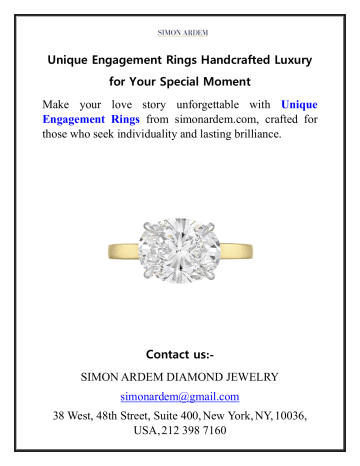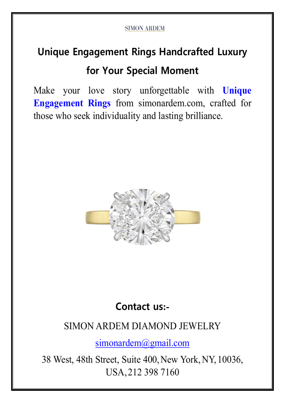 Unique Engagement Rings Handcrafted Luxury for Your Special Moment Make your love story unforgettable with Unique Engagement Rings from simonardem.com, crafted for those who seek individuality and lasting brilliance. Contact us:SIMON ARDEM DIAMOND JEWELRY [email protected] 38 West, 48th Street, Suite 400, New York, NY, 10036, USA, 212 398 7160